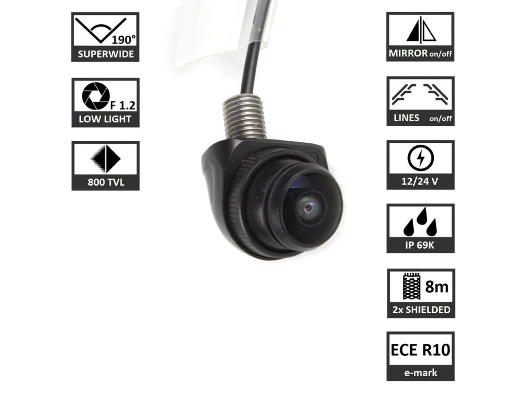 Univerzálna miniatúrna parkovacia kamera s uhlom záberu 190°, pre vonkajšiu inštaláciu IP69K, s rozlíšením 800TVL, použitie ako parkovacia kamera do priestoru ev. čísla, alebo ako bočná do spätného zrkadla, prípadne ako predná do mriežky prednej masky/nárazníka, odolné hlinníkové telo, s možnosťou zapnutia vodiacich liniek a zmeny orientácie ľavej/pravej strany obrazu.