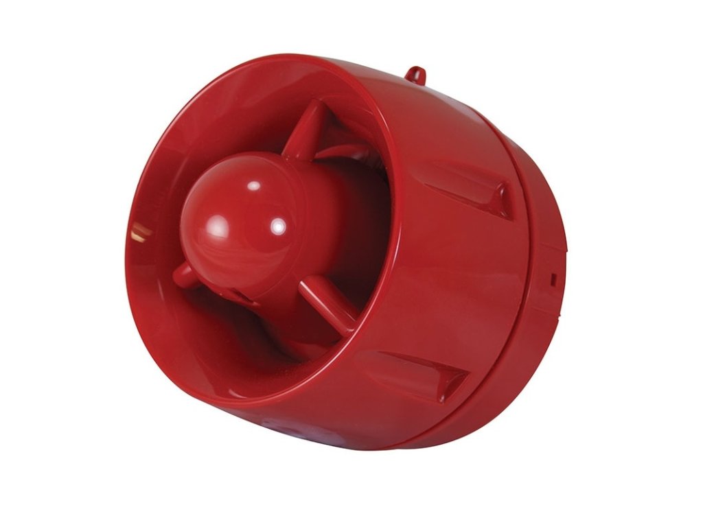 Siréna EN červená s nízkou päticou, EN 54-3, 18–30 V DC, hlasitosť nastaviteľná v 2 úrovniach priamo na zariadení, 32 signalizačných tónov, max. akustický tlak 100 dB, odber prúdu 5,5 mA pri 30 V DC , IP 21 C