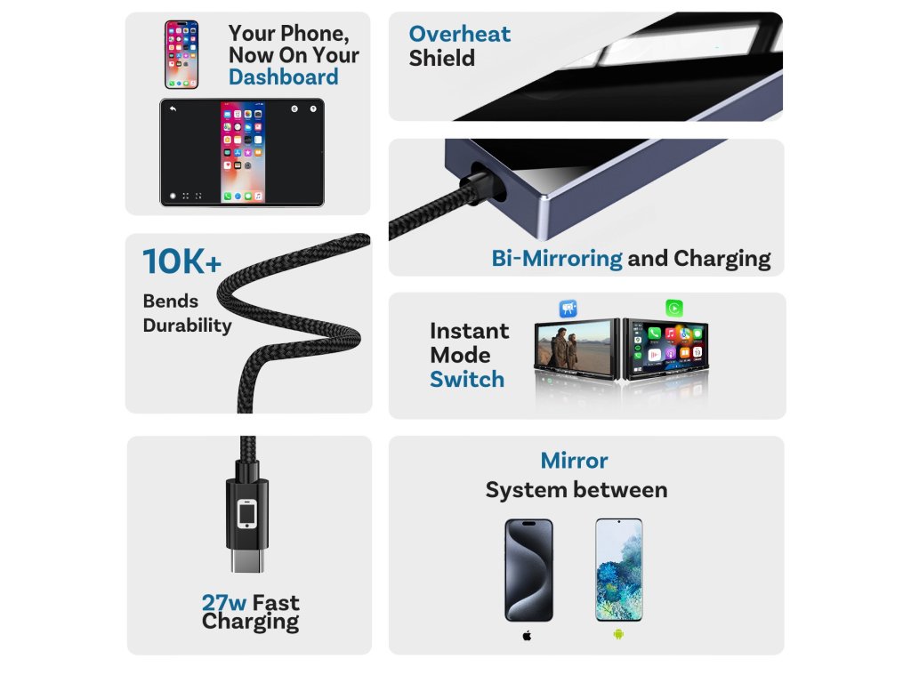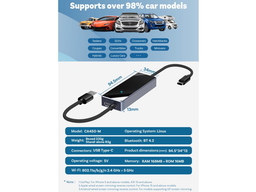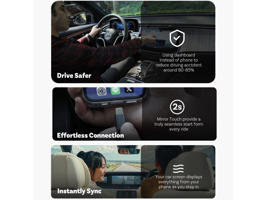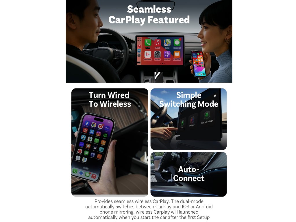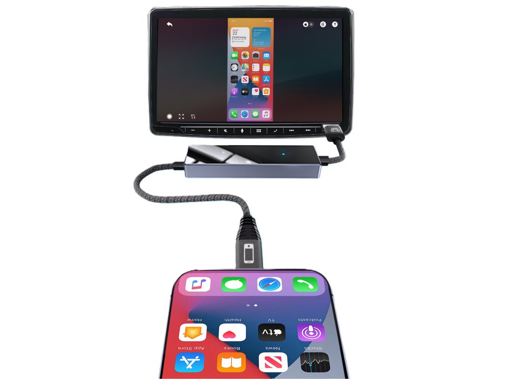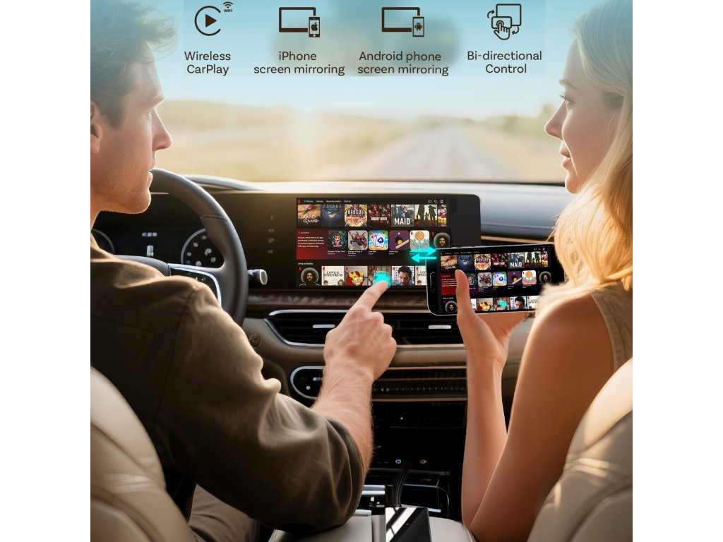 Okrem zrkadlenia obsahu telefónu bez obmedzení cez USB pripojenie, modul umožňuje aj bezdrôtové pripojenie telefónu k Apple CarPlay / AndroidAuto. Ovládanie podporovaných aplikácií zostáva zachované dotykovým displejom, tlačidlami na volante, prípadne iným spôsobom. Jednoduché zapojenie modulu - do USB slotu vozidla určeného pre telefón. Telefón sa pripája k jednotke vozidla cez modul automaticky (po prvotnom BT spárovaní).