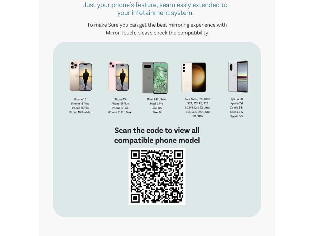CA450 podporuje smartfóny so systémom Android s technológiou DP (DisplayPort), ako aj iPhone radu 15 a 16. To vám umožňuje zrkadliť obrazovku telefónu na displej vášho auta. Skontrolujte si Vaše zariadenie či je zrkadlenie obrazovky cez DP podporované. Niektoré telefóny vyžadujú manuálne zapnutie "DeX" funkcie na hornej lište.