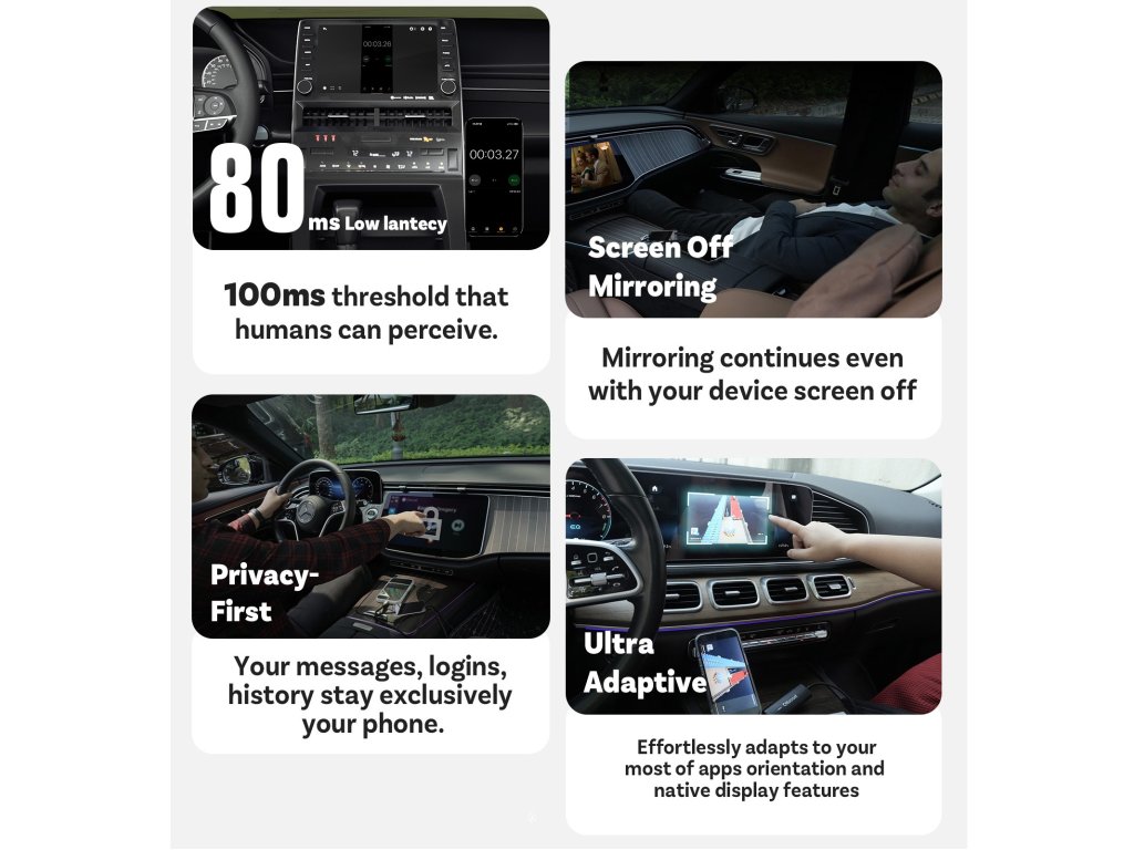 Zrkadlenie prináša funkcie zamerané na bezpečnosť a výkon. Všetky vaše správy, prihlasovacie údaje, história a dáta ostávajú uložené výhradne vo vašom telefóne, takže máte istotu maximálnej ochrany osobných dát. Vďaka oneskoreniu zobrazenia iba 0,08 sekundy ktoré ľudské oko nedokáže postrehnúť je používanie rýchle a plynulé. Vysoko prispôsobivá technológia zabezpečí že systém sa automaticky prihlási k full-screen orientácii obrazu väčšiny aplikácií a funkciám displeja, takže dokážete využiť celý potenciál telefónu.
