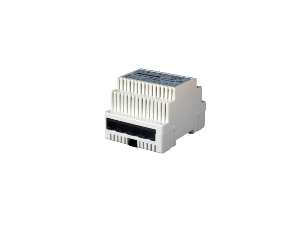 Switch 1440A pre VIP, pripojenie PC /dvernej jednotky /ďalšieho switchu, 6x RJ-45 100 Mbit/s (56 V DC pasívne PoE napájaný) port pre pripojenie a napájanie VIP video monitorov a telefónov, napájanie zdrojom 1441, rozmery 71 x 89 x 62 mm, inštalácia na DIN lištu (4 pozície).