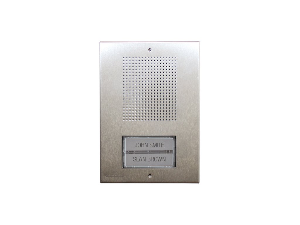 KAE5062 Dverová audio montážna sada pre 2 užívateľov, 1x dverová jednotka ET5002 s 2 tlačidlami, dizajn ocele, rozmery 95 x 135 x 6,5 mm, výstup 12 V AC pre ovládanie 1 el. zámku, montáž na alebo pod omietku, komponenty inštalačného boxu, 2x audiotelefón slúchadiel 2701W, nastavenie hlasitosti, el. 105 x 191 x 28 mm, 1x napájací zdroj 12 V AC 900 mA, montáž na DIN lištu (3 pozice), zapojenie n + 4 vodičov (5 vodičov), rozšírenie na ďalšie paralelné telefóny s rozlíšením 2702W (max. 3 kusy)
