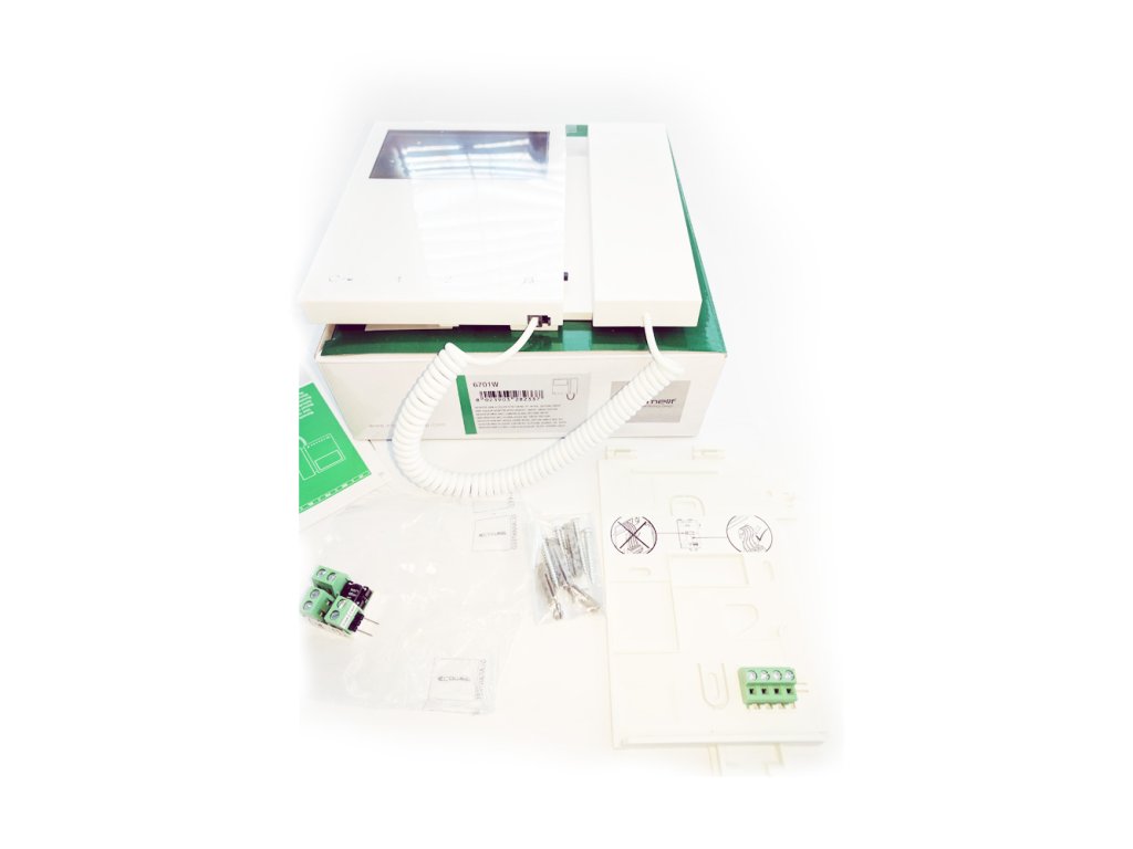 Video monitor Mini 6701W, so slúchadlom, pre SB1 a SB2 2-vodičový zmiešaný audio/video systém, 4,3" širokouhlý farebný display 16:9, 1x dotykové tlačidlo pre ovládanie zámku, 2x programovateľné tlačidlo, nastavenie hlasitosti a obrazu, rôzne vyzváňacie melódie, indikačné LED, kontakt prídavného zvonenia od dverí bytu, programovanie DIP, možnosť výmeny predného krytu na verziu 6733W s 8 programovateľnými tlačidlami, napájanie zo zbernice, biely, montáž na omietku (bez potreby doplnkového inšt. rámika), rozmery 175 x 160 x 22 mm
