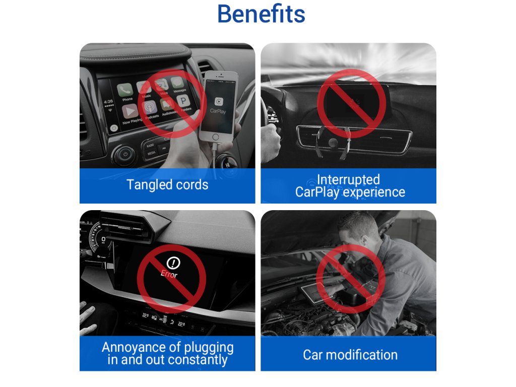 S modulom CP85 PRO nie je viac potrebné pripájať telefón do USB vozidla. Pripojenie s Apple CarPlay/Android Auto jednotkou vozidla prebehne automaticky cez WiFi, vždy po zapnutí zapaľovania. Modul zostáva trvale pripojený káblom k jednotke vozidla namiesto telefónu a Vy si môžete užívať slobodu bez kábla.
