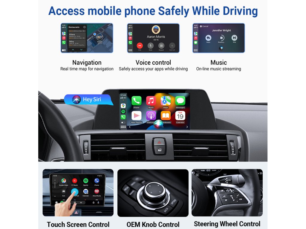 - Kompatibilné jednotky OEM jednotky Apple CarPlay/Android Auto s pripojením po kábli, aj aftermarket jednotky