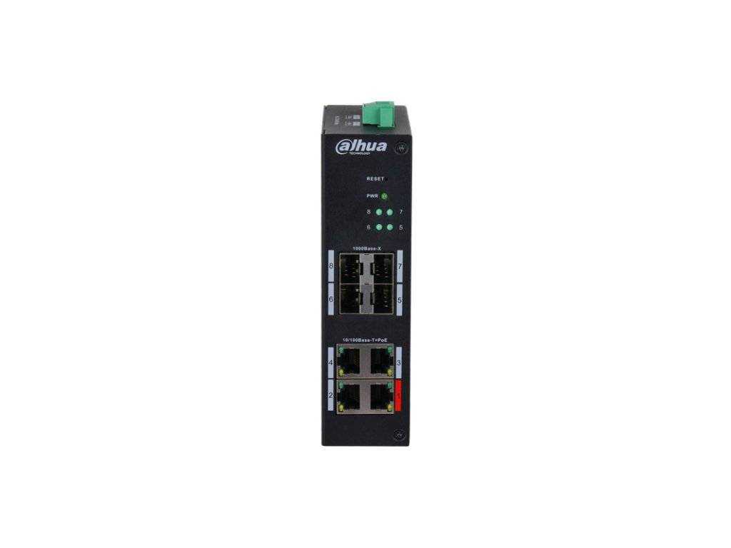 Priemyselný 8 portový PoE switch, 3x RJ-45 10/100 Mbit PoE+ (802.3af/at), 1x RJ-45 10/100 Mbit PoE++ (802.3af/at/bt, Hi-PoE), 4x SFP 1000 Mbit; PoE max. 96 W; Long Distace PoE 250 m, PoE Watchdog; manažovatelný L2; Switching Capacity: 8,8 Gbps, Packet Forwarding rate: 6,5472 Mbps, Packet Buffer Size 4,1 Mbit, MAC Table Size 8K; Ochrana pred prepätím; pracovaná teplota od -30 °C do +65 °C, rozmery: 152,9 x 110,4 x 42,0 mm, možnosť montáže na DIN lištu alebo stôl. Zdroj je súčasťou balenia