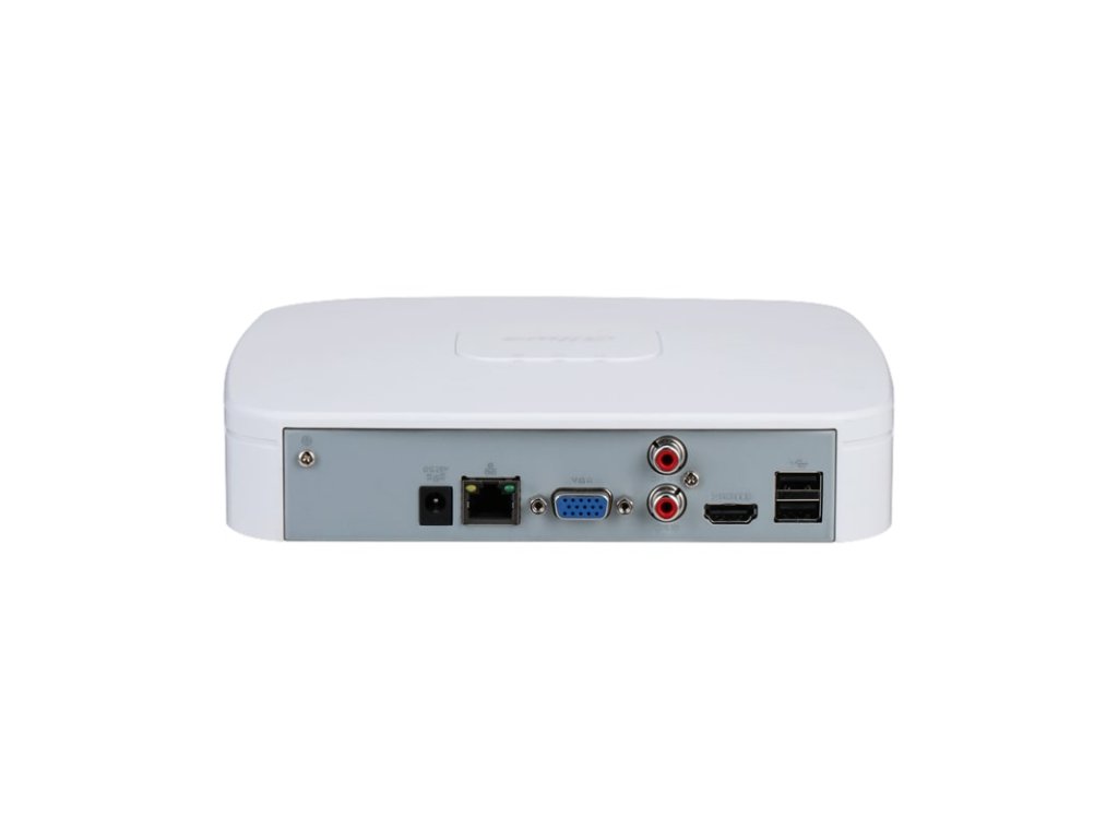 IP rekordér 4 kanály, Smart H.265+ / H.265 / Smart H.264+ / H.264; 80 Mbps incoming, 80 Mbps recording, 80 Mbps outgoing; rozlíšenie kamery max. 16 Mpx; AI funkcie na NVR: Perimeter Protection max. 2 kanály, Face Detection max. 1 kanál, Face Recognition 1 kanál (FD+FR na NVR), 4 kanálov (FD na kamere), SMD Plus 4 kanály; AI funkcie z kamier: Perimeter protection 4 kanálov, Face Detection 4 kanálov, Face Recognition 4 kanálov, SMD Plus 4 kanálov; 1x SATA max. 16 TB na 1 disk; Audio RCA I/O 1/1, 2x USB 2.0, 1x HDMI, 1x VGA, 1x 10/100 RJ-45 port; napájanie 12 V DC / 2 A, spotreba max 10 W; pracovná teplota od -10 °C do +55 °C, hmotnosť 0,45 kg, rozmery 204,6 x 206,4 x 45,6 mm