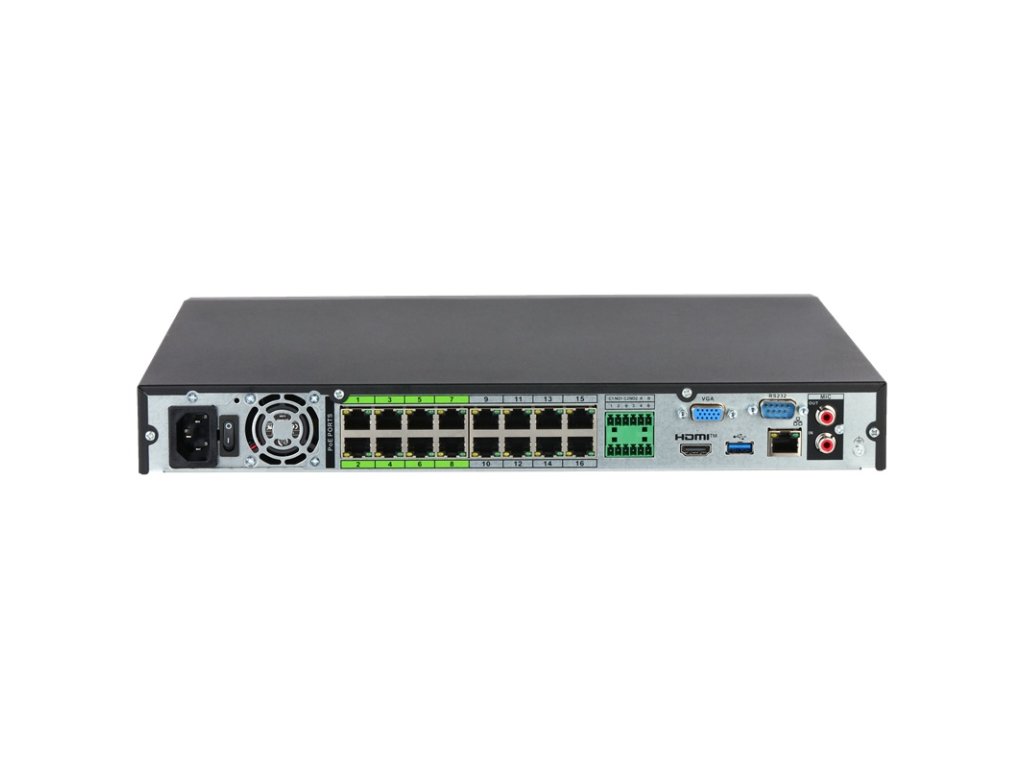 IP NVR 16-kanálov, OS Linux, podporované formáty Smart H.265+ / Smart H264+ / H.264 / H.265; záznam max. do 448 Mbps (Pri AI max 200 Mbps), maximálne rozlíšenie 32 Mpx na kameru; Inteligentné funkcie v NVR: Acu Pick by NVR max. 4 kanály, AcuPick NVR + AcuPick kamera max. 16 kanálov, Perimeter Protection max. 8 kanálov, Face Detection max. 4 kanály, Face Recognition max. 16 kanálov (FD kamera + FR NVR), max. 4 kanály (FR+ FD na NVR), SMD Plus max. 16 kanálov, Video Metadata max. 4 kanály; podpora video analytických funkcií z kamier: Face detection, Face recognition, Video metadata, Perimeter protection; SMD, Stereo analysis, Crowd distribution, People counting, ANPR, Vehicle density, Heat map, PPE detection, Smart object detection, Smart sound detection, AcuPick; 16x RJ-45 10/100 Mbps PoE+ (802.3 af/at) 8x ePoE, maximálne 25,5 W port, spolu max. 130W, 1x RJ-45 port (10/100/1000 Mbps), 1x HDMI (max. 7680 x 4320), 1x VGA, 1x RS-485, 1x RS-232, 2x USB (z toho 1x USB 3.0) , Audio RCA I/O 1/1, Alarm I/O 4/2, 2x SATA max. 20 TB; 375,0 × 329,6 × 53 mm, hmotnosť 2,62 kg (bez HDD), napájanie 100-240 VAC 50/60 Hz, pracovná teplota od -10 °C do + 55 °C.