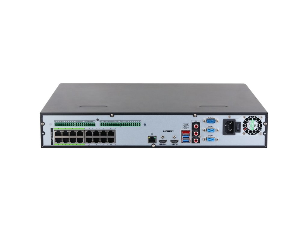 Videorekordér IP sieťový 16-kanálový, záznam / živý obraz / prehrávanie v 4K, OS Linux, podporované formáty Smart H.265+ / Smart H264+ / H.264 / H.265; záznam max. do 384 Mbps (Pri Ai max 200 Mbps), maximálne rozlíšenie 32 Mpx na kameru; 4x SATA III 3.5" HDD, max. 20 TB / HDD, podpora ONVIF; video analytické funkcie na NVR: Perimeter Protection max. 16 kanálov, Face Detection max. 8 kanálov, Face Recognition max. 16 kanálov (FD kamera + FR NVR), max. 8 kanálov (FR+ FD na NVR), SMD Plus max. 16 kanálov, Video Metadata max. 8 kanálov; podpora video analytických funkcií: AcuPick, Face Detection, IVS, Face Recognition, Video Metadata, SMD Plus, Stereo Analysis, crowd disribution, people counting, heat map, ANPR, PPE detection; 1x RJ-45 port (10/100/1000 Mbps), 2x HDMI + 2x VGA, 1x RS-485 (half-duplex), 1x RS-232, 3x USB (z toho 2x USB 3.0), 1x eSATA , Audio RCA I/O 1/2, Alarm I/O 16/6 (1x 12V 1A output), 16x RJ-45 10/100 IEEE 802.3 af/at, max. 200 W, jeden port max. 25,5W, 1-8 podpora ePoE; rozmery 440,0 × 414,6 × 76 mm, hmotnosť 4,58 kg (bez HDD), 100–240 VAC, 50/60 Hz, pracovná teplota od -10 °C do +55 °C