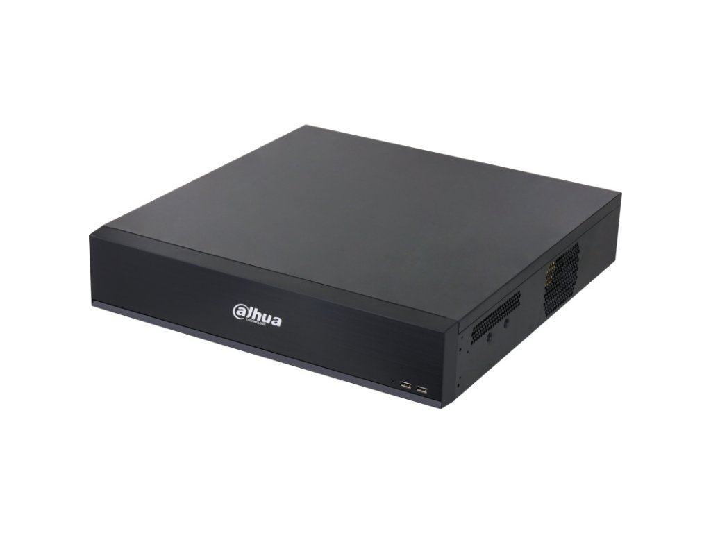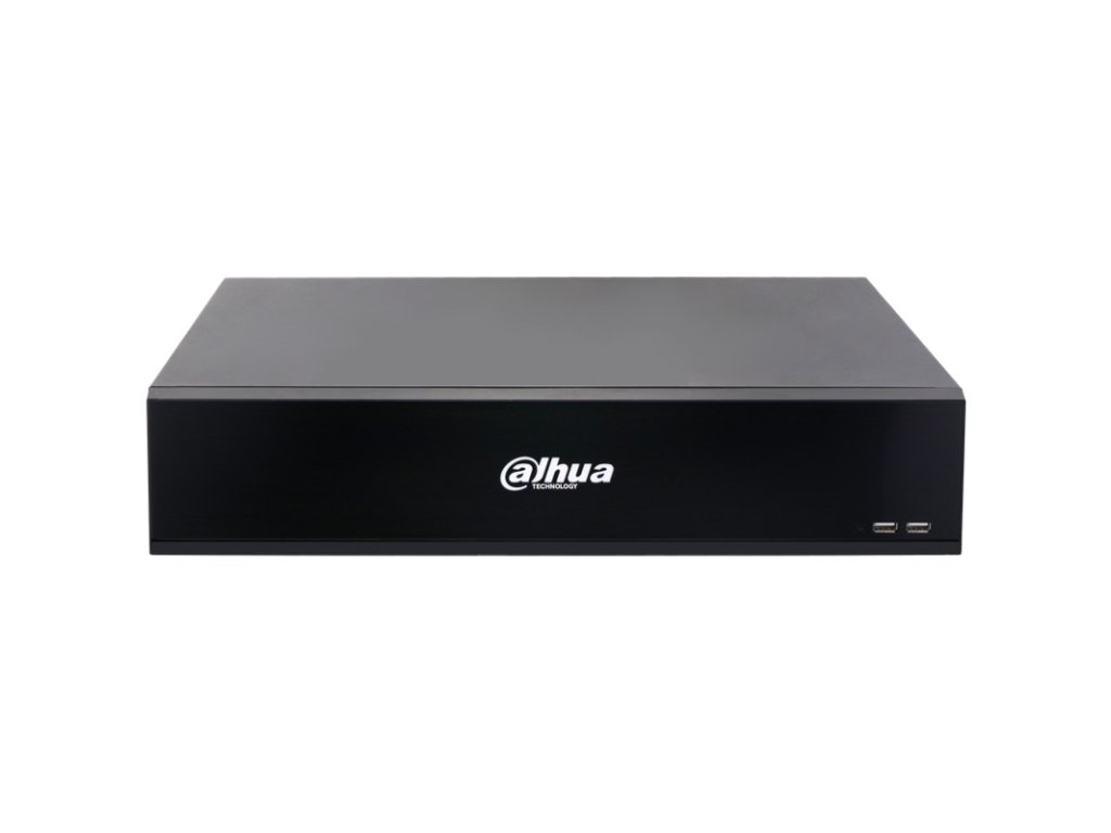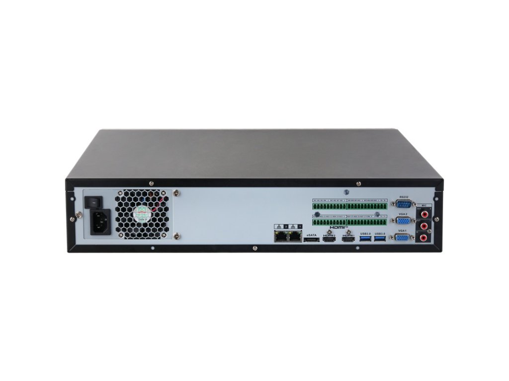 IP sieťový videorekordér, 64-kanálový, záznam / živý obraz / prehrávanie v 4K, OS Linux, podporované formáty Smart H.265+ / Smart H.264+ / H.264 / H.265; záznam max. do 512 Mbps (pri povolenej AI max. 200 Mbps), maximálne rozlíšenie 32 Mpx na kameru; 8x SATA III 3.5" HDD, max. 20 TB/HDD, RAID 0/1/5/6/10, podpora ONVIF, podpora IP PTZ kamier Dahua; video analytické funkcie na NVR: AcuPick max. 36 kanálov (NVR + kamera), Perimeter Protection max. 24 kanálov, Face Detection max. 8 kanálov, Face Recognition max. 32 kanálov (FD kamera + FR NVR), max. 8 kanálov (FR + FD na NVR), SMD Plus max. 32 kanálov / 64 kanálov pri SMD Plus kamere, Video Metadata max. 8 kanálov; podpora video analytických funkcií: AcuPick, Face Detection, IVS, Face Recognition, Video Metadata, SMD Plus, Stereo Analysis, distribúcia davu, počítanie osôb, ANPR, hustota dopravy, monitoring objektov; 2x RJ-45 port (10/100/1000 Mbps), 2x HDMI + 2x VGA, 2x RS-485 (1x half-duplex + 1x full-duplex), 1x RS-232, 4x USB (z toho 2x USB 3.0), 1x eSATA, Audio RCA I/O 1/2, Alarm I/O 16/8; 440,0 mm × 452,5 mm × 94,9 mm, 100–240 VAC, 50–60 Hz, prevádzková teplota od -10 °C do +55 °C.