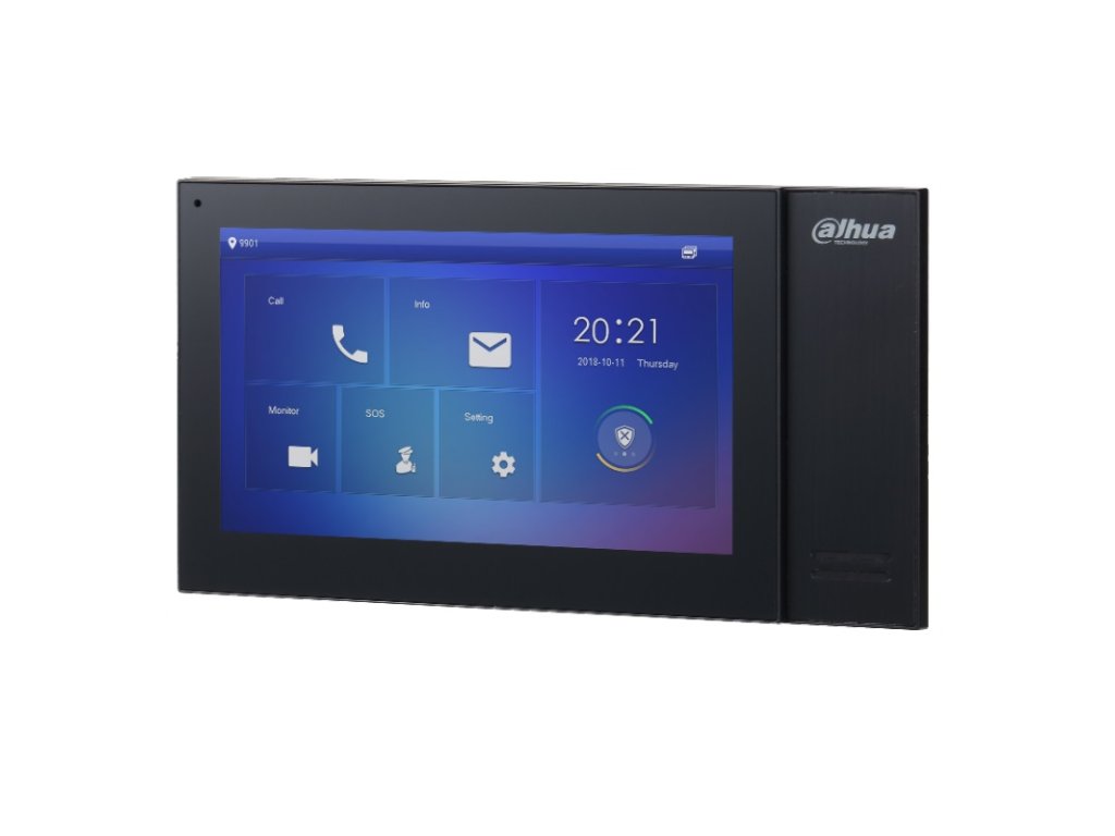 IP Dahua handsfree videomonitor, prevedenie čierny plast, 7" farebný dotykový LCD displej s rozlíšením 1024 x 600 px, H.264 kompresia, TCP/IP komunikácia, grafické menu, možnosť automatického vytvorenia obrázkov pri neprijatom hovore alebo videa pri zanechaní odkazu po vložení micro SD karty (je súčasťou monitora, vstavaná pamäť 8 GB), interkom v rámci viacerých monitorov v byte (max. 6 monitorov), pripojiteľnosť až 20 dverných jednotiek a externých CCTV Dahua IP kamier, podpora prenosu video hovoru / push notifikácie na Android a iOS smartfony cez internet (aplikácie DMSS), 1x RJ45 konektor pre pripojenie do siete, 6x NO kontakt pre pripojenie alarmových vstupov - funkcia EZS ústredne, 1x NO alarmový výstup, ovládanie 2 zámkov, prizvonenie od dverí, napájanie externým zdrojom 12 V DC / 2000 mA (zdroj nie je súčasťou balenia), alebo PoE 802.3af switchom, montáž na povrch, rozmery 222 x 120 x 22 mm, interiérové použitie