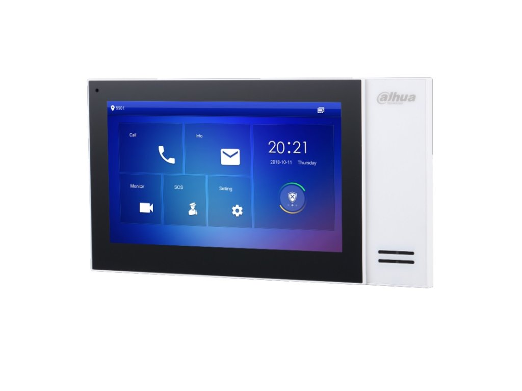 IP Dahua handsfree videomonitor, prevedenie biely plast, 7" farebný dotykový LCD displej s rozlíšením 1024 x 600 px, H.264 kompresia, TCP/IP komunikácia, grafické menu, možnosť automatického vytvorenia obrázkov pri neprijatom hovore alebo videa pri zanechaní odkazu po vložení micro SD karty (je súčasťou monitora, vstavaná pamäť 8 GB), interkom v rámci viacerých monitorov v byte (max. 6 monitorov), pripojiteľnosť až 20 dverných jednotiek a externých CCTV Dahua IP kamier, podpora prenosu video hovoru / push notifikácie na Android a iOS smartfony cez internet (aplikácie DMSS), 1x RJ45 konektor pre pripojenie do siete, 6x NO kontakt pre pripojenie alarmových vstupov - funkcia EZS ústredne, 1x NO alarmový výstup, ovládanie 2 zámkov, prizvonenie od dverí, napájanie externým zdrojom 12 V DC / 2000 mA (zdroj nie je súčasťou balenia), alebo PoE 802.3af switchom, montáž na povrch, rozmery 222 x 120 x 22 mm, interiérové použitie