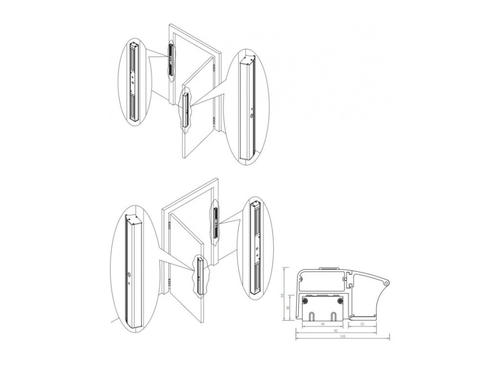 Elektromagnetická prídržná lišta, hliníkový profil na dvere s madlom, vstavané odchodové tlačidlo, montážny kus na zárubne 2x elektromagnet, prídržná sila 600 kg, rozmery 600 x 105 x 58 mm, napájanie 12–24 V DC max. 920 mA (pri 12 V DC)
