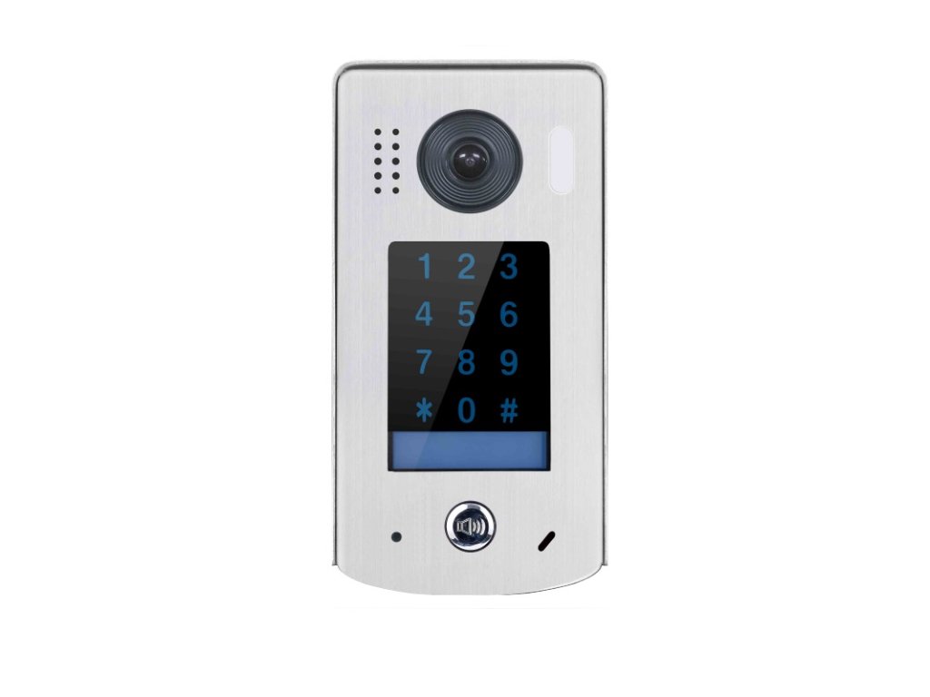 Dverná kamerová jednotka farebná s jedným tlačidlom a dotykovou kódovou klávesnicou, podsvietená menovka a klávesnica, prevedenie kov, prisvetlenie snímaného priestoru, širokouhlá kamera 170°, IP 43, 12 V DC alebo relé ovládanie pre 1 zámok, rozmery 90 x 180 x 36 mm, so strieškou, montáž na omietku, napájanie 24 V DC zo zbernice systému, dvojvodičový systém zapojenia - nepolarizovaný, odporúčaný netienený krútený pár, min. 2x 1 mm