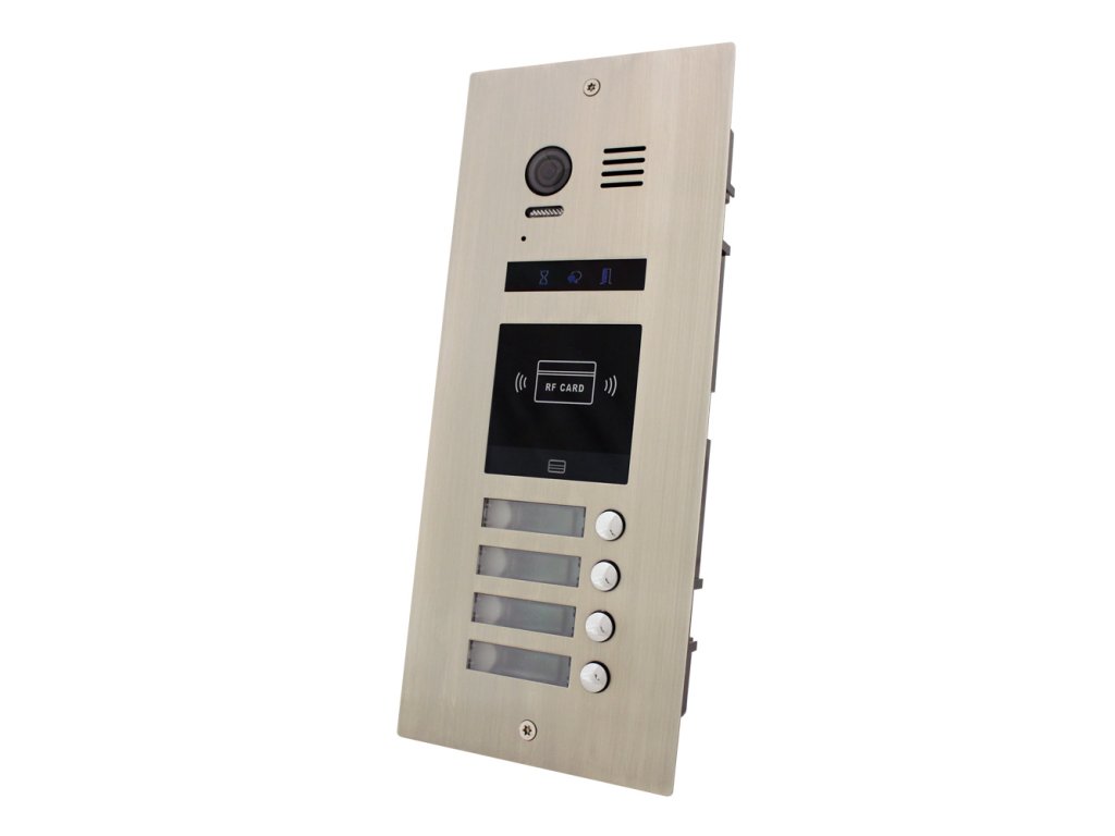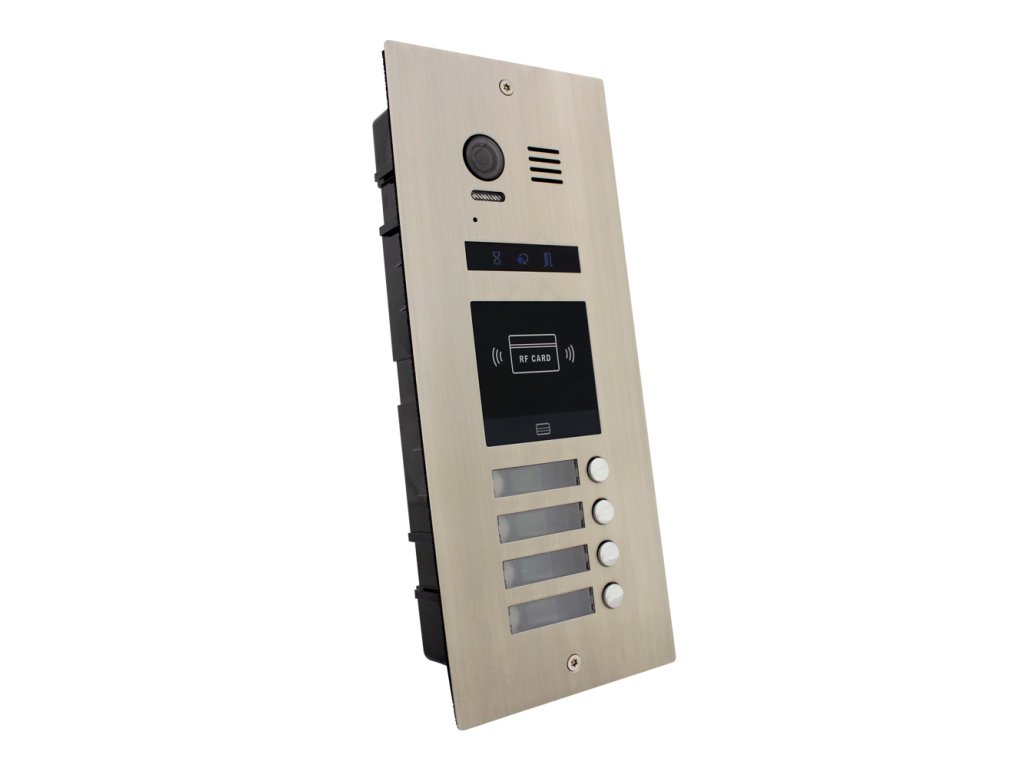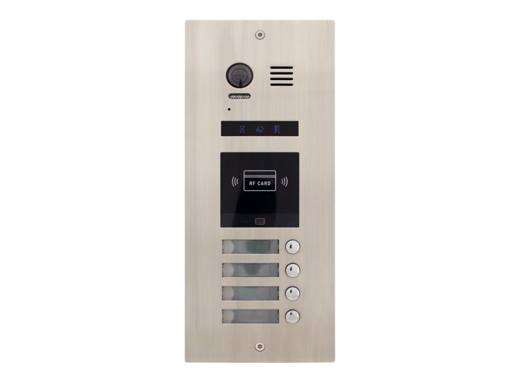 Dverná jednotka, video, 4 tlačidlá, antivandal, podsvietené menovky, indikácia stavu hovoru, prevedenie antikor, biele LED prisvetlenie snímaného priestoru, farebná kamera, uhol záberu 105°, krytie IP 43, 12 V DC alebo NO/NC relé ovládanie pre 1 zámok, (možnosť pridať RLC modul pre 2. zámok), nastaviteľná dĺžka otvorenia 1–99 s, zabudovaná RFID čítačka kariet 125 kHz (kapacita 300 užívateľov, možnosť priradenia a editácie kľúčenky ku konkrétnemu bytu), možná záloha prístupových kariet a čipov, rozmery 133 x 316 x 52 mm, montáž pod omietku, inšt. krabica súčasťou, napájanie 24 V DC zo zbernice systému, dvojvodičový systém zapojenia - nepolarizovaný, odporúčaný netienený krútený pár, min. 2 x 1 mm, pre správnu funkčnosť systému je potrebné použiť napájací zdroj LRS-100-24