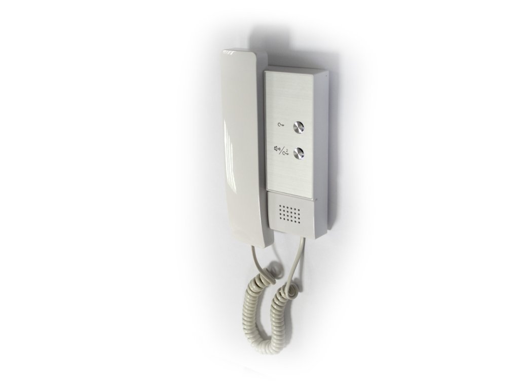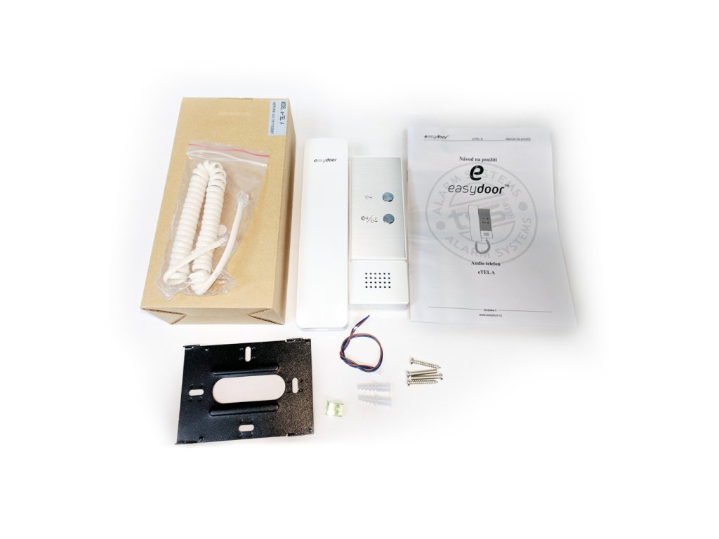 Easydoor audiotelefón so slúchadlom, prevedenie biely plast / hliník, bez displeja, mechanické tlačidlá, bez pamäte, skupinové volanie v rámci viacerých monitorov v byte, kontakt prídavného zvonenia od dverí bytu, nezávislé ovládanie 2 zámkov, adresácia DIP prepínačmi, napájanie 24 V DC zo zbernice systému (odporúčaný krútený pár, min. 2x 1 mm), montáž na povrch, rozmery 97 x 187 x 33 mm, interiérové použitie