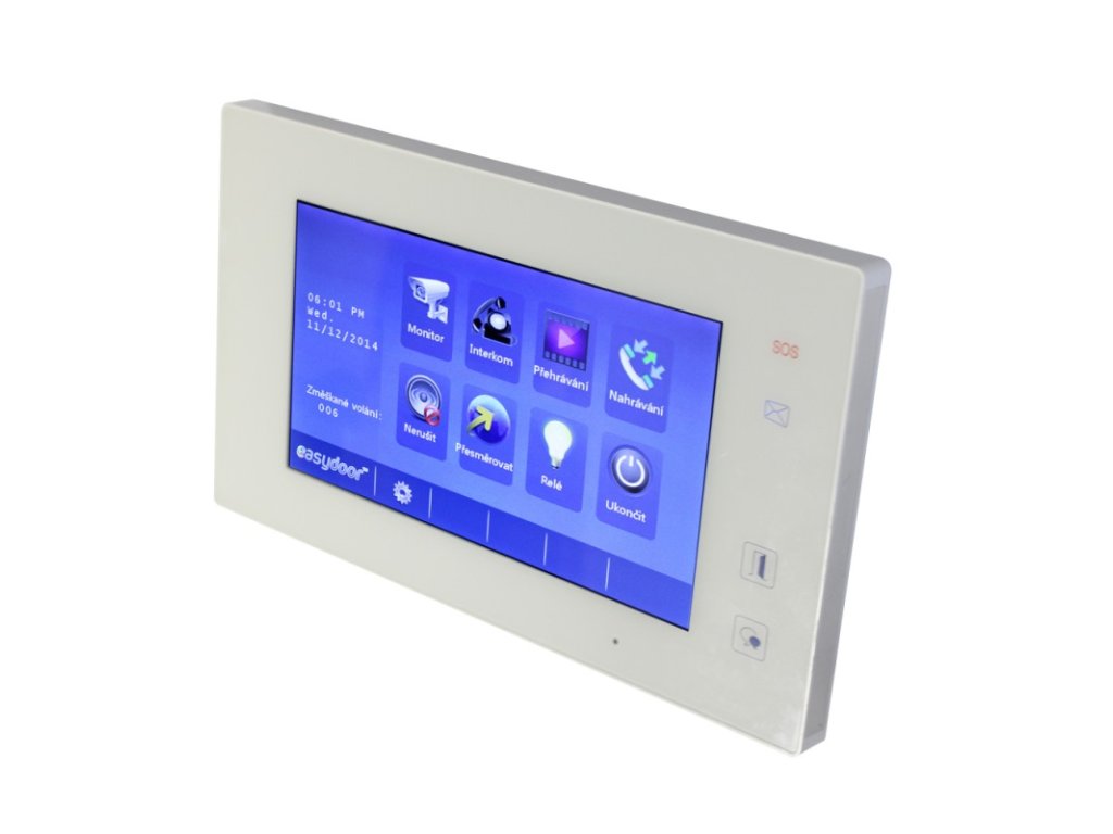 Easydoor handsfree videomonitor, slim dizajn, prevedenie biely plast, 7" farebný dotykový LCD displej, grafické menu, interná pamäť 118 snímkov pri zazvonení (možnosť doplnenia MicroSD karty pre rozšírenie kapacity pamäte pre videozáznam), interkom medzi bytmi, skupinové volanie v rámci viacerých monitorov v byte, kontakt prídavného zvonenia od dverí bytu, 12 V DC výstup na doplnkové prizvonenie, nezávislé ovládanie 2 zámkov, adresácia cez menu, znížený odber, napájanie 24 V DC zo zbernice systému (odporúčaný krútený pár, min. 2 x 1 mm), montáž na povrch, rozmery 226 x 132 x 18 mm, interiérové použitie