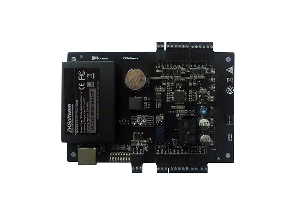 IP prístupový kontrolér, prevedenie plošný spoj, pripojenie 2x RFID čítačiek (Wiegand), ovládanie 1 dvier obojsmerne, kapacita 30 000 užívateľov, 100 000 udalostí, komunikácia s PC cez TCP/IP alebo RS485, LED signalizácia stavov, 1x NO/NC relé zámku (5A/30VDC), 1x relé vstup dverného kontaktu, 1x relé vstup odchodového tlačidla, 1x relé univerzálny AUX výstup (2A/30VDC), napájanie 9,6 - 14,4 VDC, odber max. 1A/12VDC (zdroj nie je súčasťou), rozmery 145x106x20mm (vhodná inšt. krabica KR380 + napájací zdroj HDR-15-15), interiérové použitie, umiestnenie v chránenej zóne, podpora globálneho Anti-passbacku a linkovania medzi kontrolérmi, podľa počtu ovládaných dverí a pripojených modulov potrebná licencia pre profesionálny softvér ZKBioCVSecurity