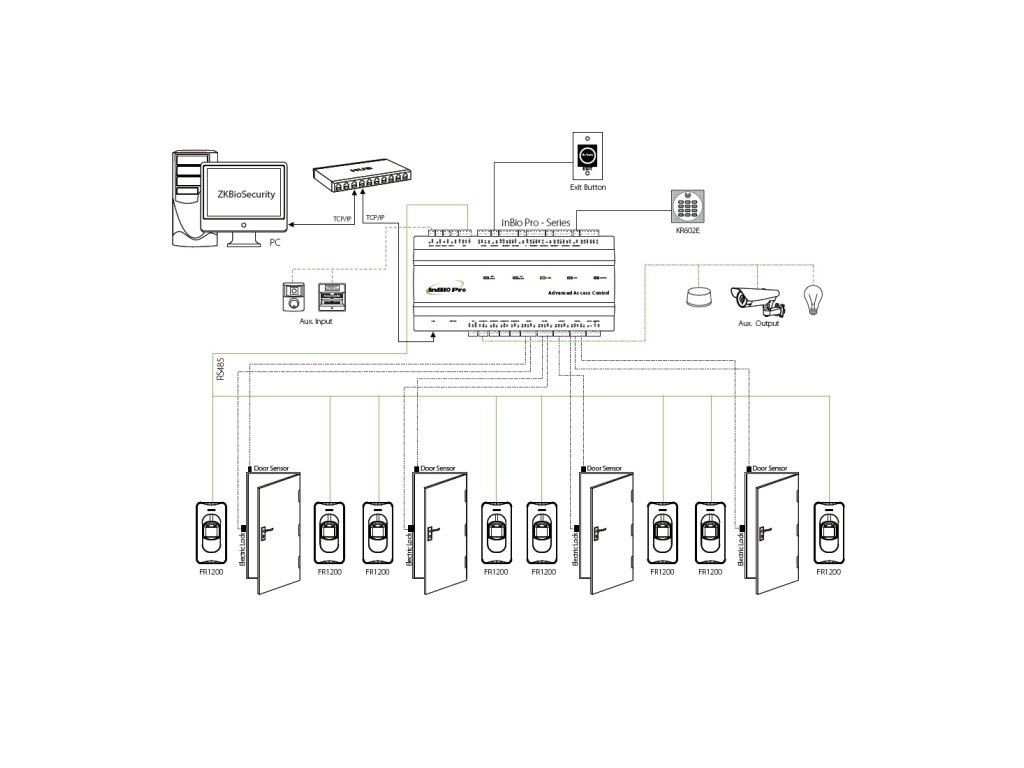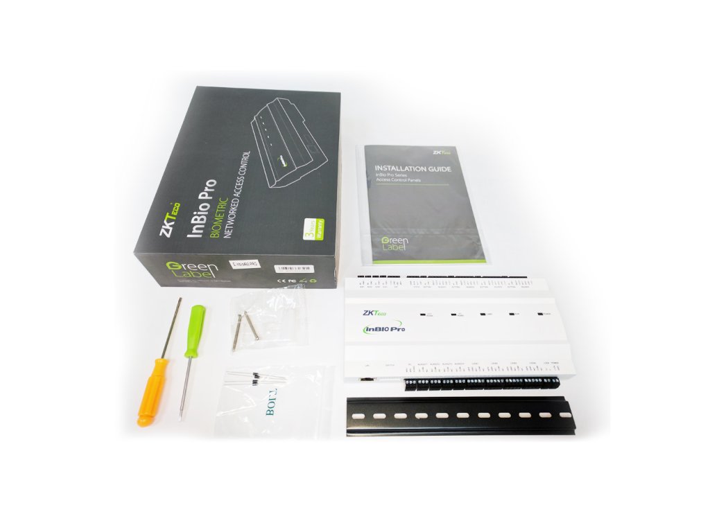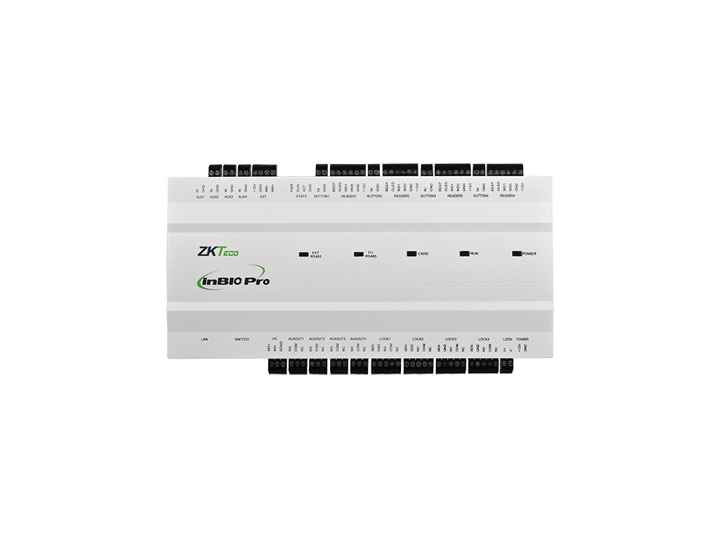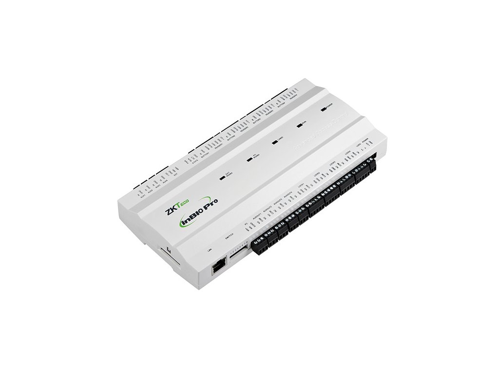 IP prístupový kontrolér, pripojenie 4x RFID čítačiek (Wiegand) pre ovládanie 4 dvier jednosmerne alebo pripojenie 8x biometrických čítačiek FR1200 (RS-485) pre ovládanie 4 dvier obojsmerne, kapacita 3 000 odtlačkov, 30 000 užívateľov, 100 000 udalostí, komunikácia s PC cez TCP/IP alebo RS-485, LED signalizácia stavov, 4x NO/NC relé zámku (5 A / 30 V DC), 4x relé vstup dverného kontaktu, 4x relé vstup odchodového tlačidla, 4x relé univerzálny AUX vstup, 4x relé univerzálny AUX výstup (2 A / 30 V DC), ovládací softvér súčasťou, napájanie 9,6–14,4 V DC, odber max. 1,5 A / 12 V DC (zdroj nie je súčasťou), rozmery 226 x 106 x 36 mm (vhodná inšt. krabica KR380 + napájací zdroj HDR-15-15), montáž na DIN lištu, interiérové použitie, umiestnenie v chránenej zóne, podpora globálneho Anti-passbacku a linkovania medzi kontrolérmi, podľa počtu ovládaných dverí a pripojených modulov potrebná licencia pre profesionálny softvér ZKBioCVSecurity