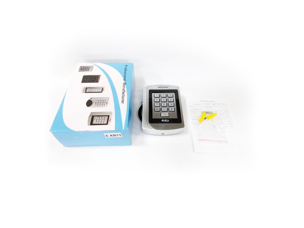 Hybridná autonómna prístupová čítačka s RFID a podsvietenou kódovou klávesnicou, čítanie bezkontaktných kariet a kľúčeniek (EM 125 kHz), čítacia vzdialenosť do 5 cm, kapacita 2000 užívateľov, LED a piezo indikácia stavov, 1x NO/NC relé zámku (max 2 A / 12 V DC), 1x relé vstup dverného kontaktu, 1x relé výstup alarmu, 1x relé vstup odchodového tlačidla, optický tamper, nastaviteľné časy otvorenia zámku, poplachu, bez možnosti zálohovania, 1x Wiegand26 vstup / výstup, napájanie 12–24 V DC / 12–18 V AC, odber 60 mA / 12 V DC, (zdroj nie je súčasťou), IP 65, exteriérové použitie od -20 °C do +60 °C, povrchová montáž, antivandal kovové prevedenie, rozmery 120 x 76 x 23 mm