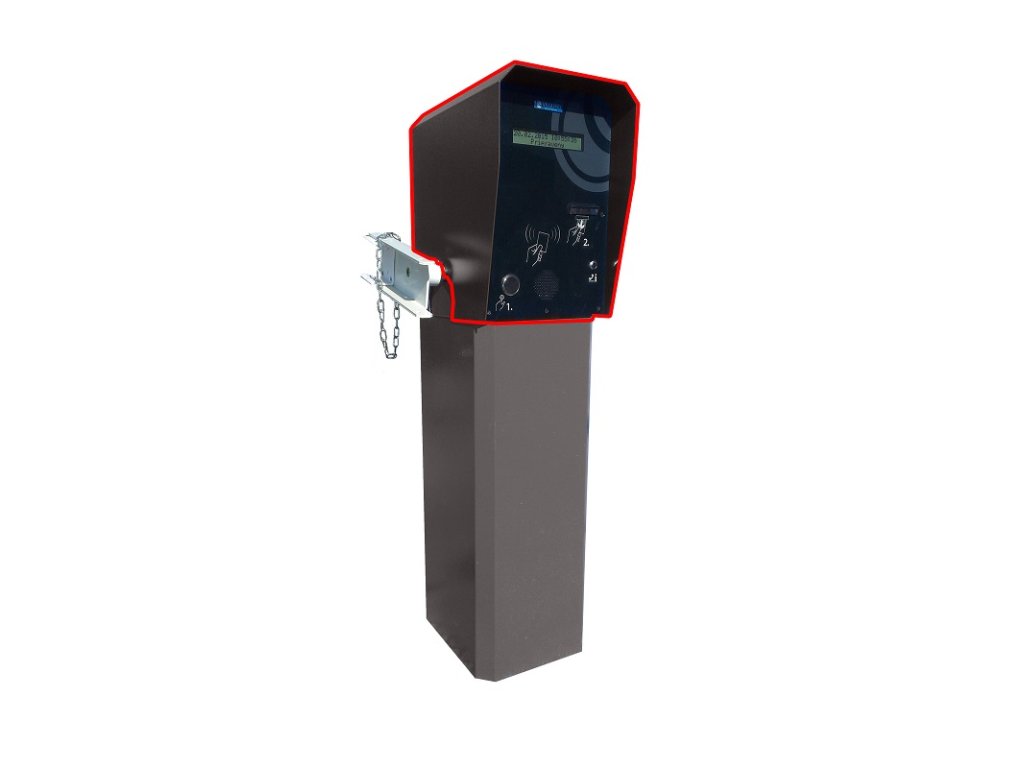 Výjazdový terminál pre čítanie kariet s čiarovým kódom, stacionárny scanner, pre systém Easypark, povrchová úprava zinkovanie a prášková farba, montáž na závoru, závora nie je súčasťou balenia, rozmery celkovo 290 x 400 x 1500 mm