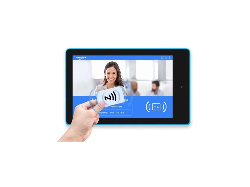 Dochádzkový terminál s veľkou 10" dotykovou obrazovkou. Podporuje RFID 13,56 MHz. Terminál disponuje POE napájaním, ale aj možnosťou napájania adaptérom. Súčasťou terminálu je aj uchytenie na stenu, ktoré umožňuje jednoduchú inštaláciu. Funkčný iba v online stave.