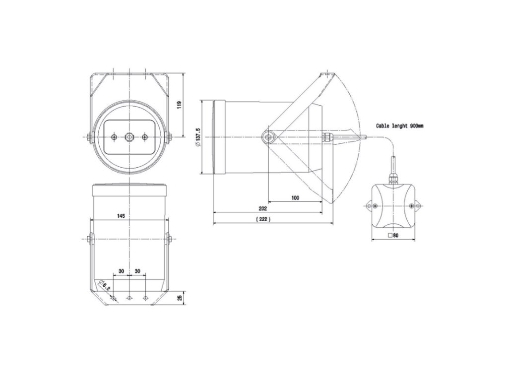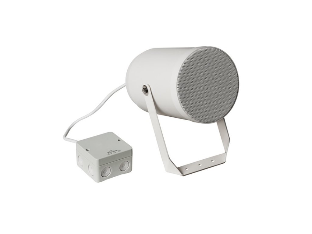 Zvukový projektor 20 W / 100 V, odbočky 20 / 10 / 5 / 2,5 W, citlivosť 75 dB (1 W / 4 m, 500 Hz–5 kHz), frekvenčný rozsah 150 Hz–20 kHz, vyžarovací uhol 230° (1 kHz), reproduktor 130 mm, skrutkovacia keramická svorkovnica s tepelnou poistkou, plastová skrinka, rozmery 145 x 222 mm, krytie IP 66, vonkajšie použitie typ B, biely, montáž na omietku, hmotnosť: 1,44 kg, EN 54-24, BS-5839-8