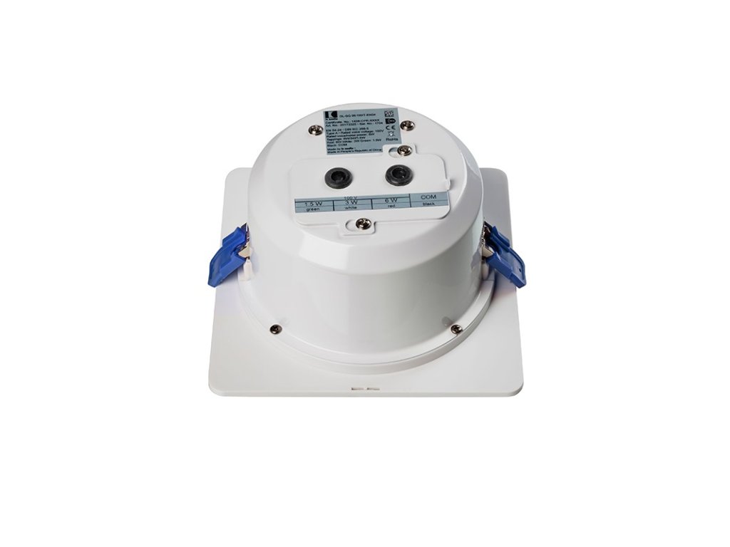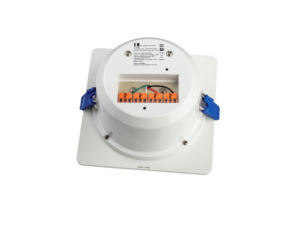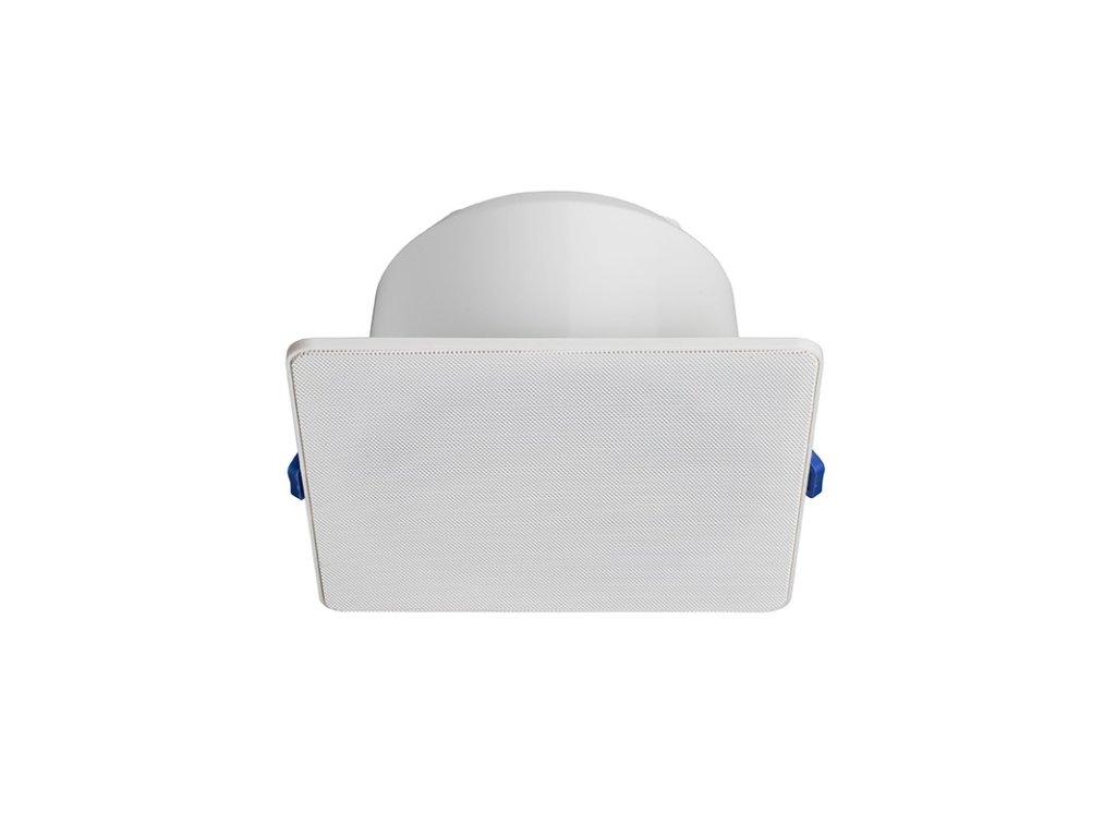 Stropný reproduktor 6 W / 100 V s protipožiarnym krytom, s moderným štvorcovým vzhľadom, magnetický úchyt mriežky, odbočky 6 W, 3 W, 1,5 W, citlivosť 97 dB (1 W / 1 m), frekvenčný rozsah 80 Hz–20 kHz, vyžarovací uhol 180° (1 kHz), montážny otvor 159–165 mm, vonkajší rozmer 180 x 180 mm, vnútorné použitie typ A, biely RAL 9016, pružinová montáž do podhľadu, IP 21, EN 54-24