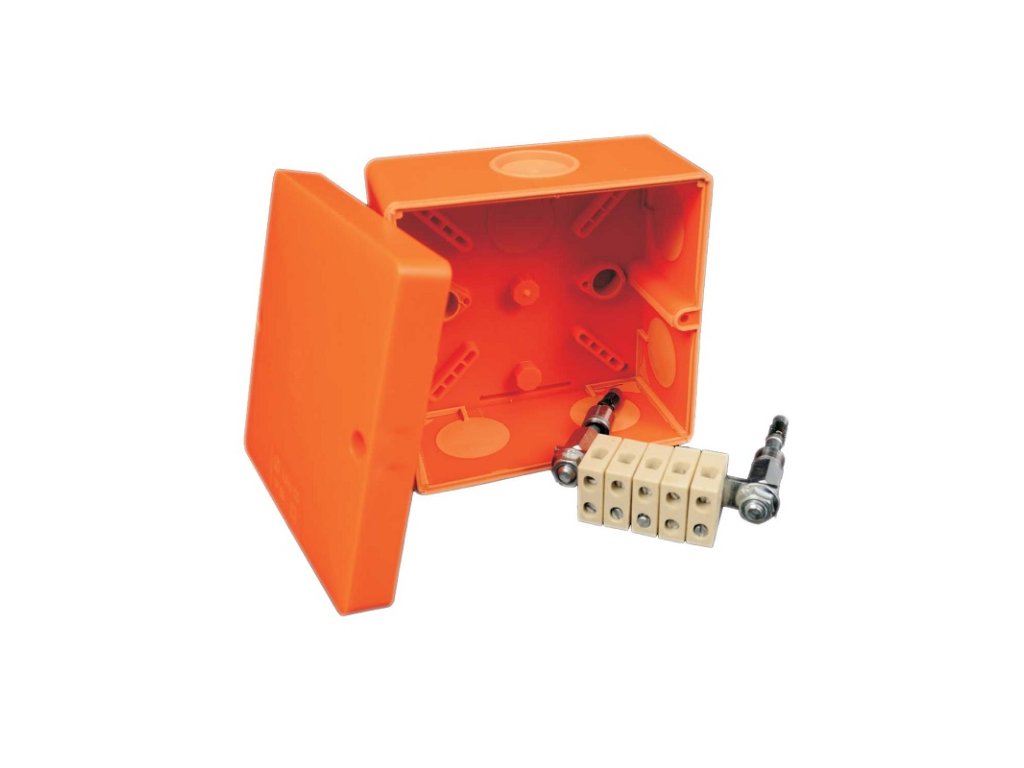 Inštalačná krabica pre odbočenie HSP kabeláže podľa STN 92 0205, požiarna odolnosť PS90, bezhalogénové LSOH prevedenie, keramická svorkovnica so zachovaním funkčnosti pri požiari, max. 5 vodičov s prierezom od 1,5 do 6 mm, krytie IP 66, rozmery 126 x 53 x 126 mm, farba oranžová