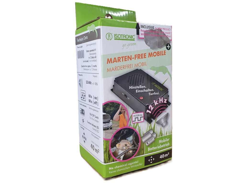 Univerzálny vysokofrekvenčný odpudzovač kún, napájaný 4 x C batériami (R14) s dlhou životnosťou. Kvalitný nemecký produkt pre použitie ako v automobiloch, tak aj doma, v garáži, alebo pod altánkom kde nie je prívod elektriny.