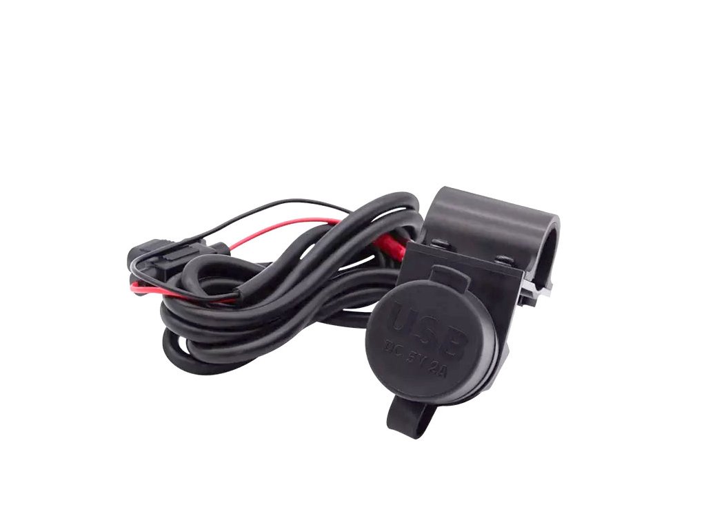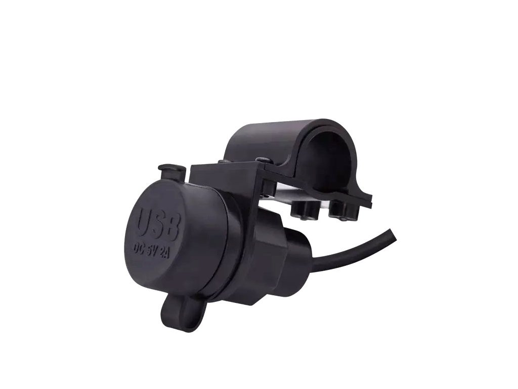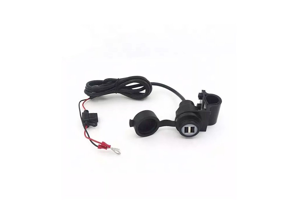 Nabíjačka USB-A 2x, 5V, 2.1A, vodeodolná, s držiakom pre montáž na riadidlá, alebo rám kruhového prirezu. Ideálna pre motocykle, alebo ATV.