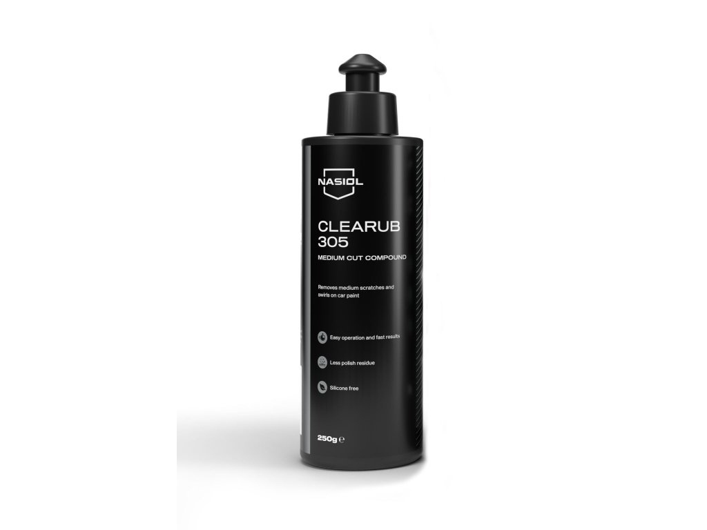Nasiol CLEARUB 305-S stredne silná leštiaca pasta navrhnutá na odstránenie stredne hlbokých škrabancov. Pripraví povrch na nanášanie nano keramickej ochrany a je tiež ideálnou voľbou pre dokončovacie práce na odolných vrchných náteroch a voskoch. Zabezpečí efekt vysokého stupňa lesku.
