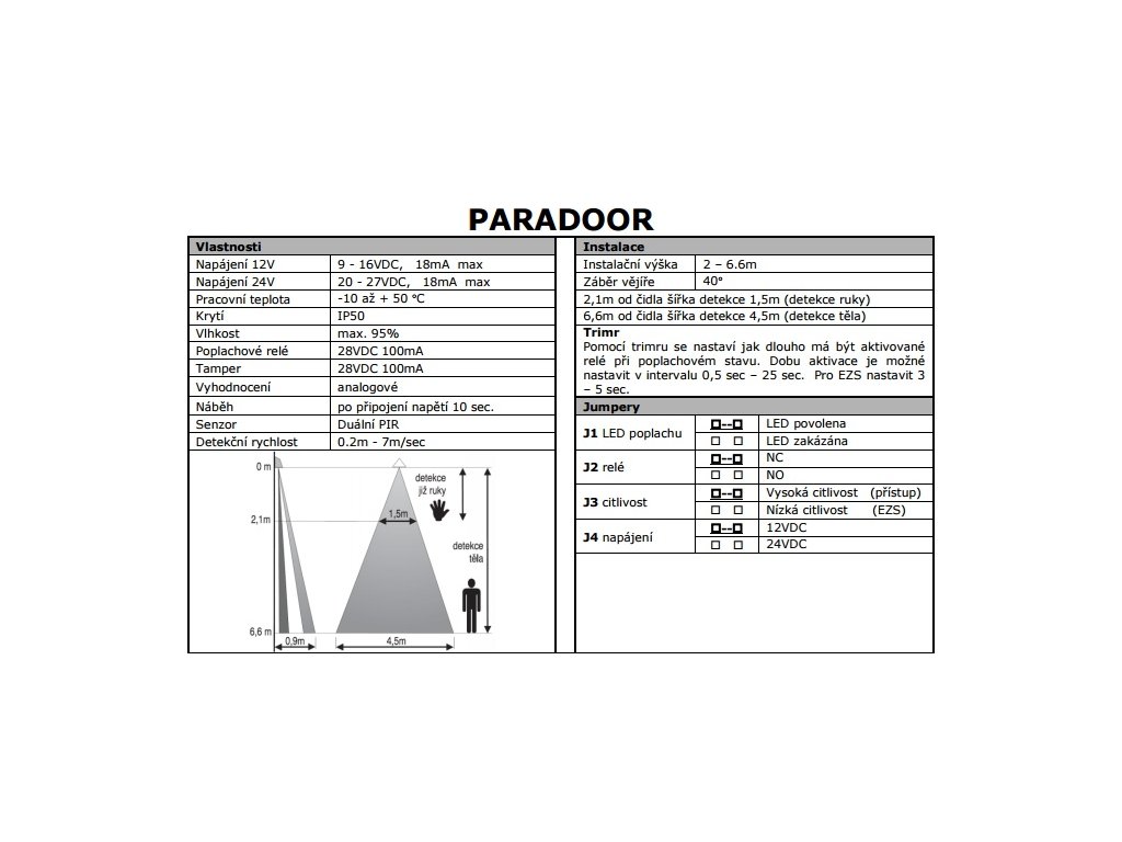 Digitálny snímač pohybu PIR s charakteristikou vertikálnej záclony, ochrana obrazov, ACCESS systémy apod, časovatelný relé výstup NO / NC, automatická teplotná kompenzácia, -10 až +50°C, max. prúdový odber 25 mADodatočné parametre