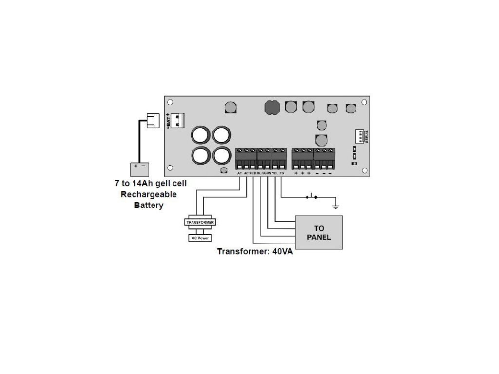 Doplnkový zdroj 2,5 A pripojiteľný k zbernici, inteligentná komunikácia s ústredňou, výstup 1,2 A na akumulátor, napájanie cez trafo 40 VA, vyžaduje TRAFO a AKU!