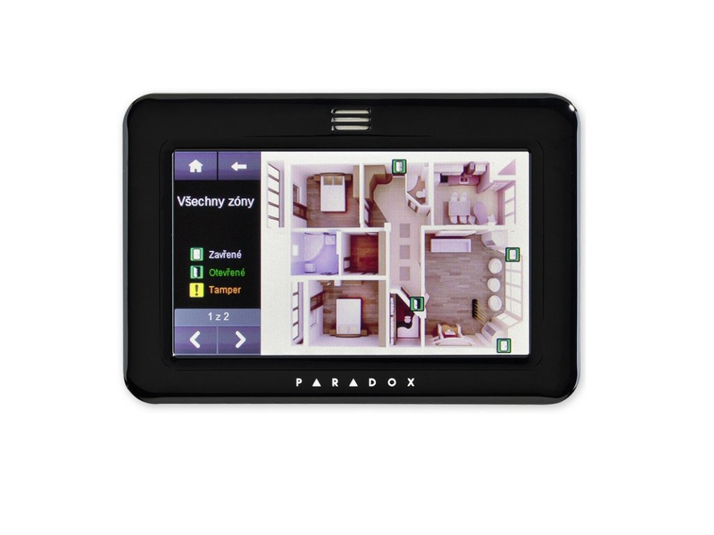 Dotyková ovládacia klávesnica čierna, pre rady SP / MG / EVO, grafický dotykový farebný LCD displej 6,4 x 11,2 cm, signalizácia všetkých stavov pomocou ikon a popisov, prehľadné a pohodlné ovládanie priamo na dotykovom LCD, zobrazenie pôdorysov objektu so zobrazením stavu snímačov, zobrazenie Annunciátor-prehľadné zobrazenie stavu podsystémov a zón, 1 kláves. zóna/vstup pre vonkajší teplomer, zobrazenie vnútornej + vonkajšej teploty (externé čidlo), užívateľské prispôsobenie vzhľadu, obrázkov a radu zvukov, napájanie 11–16 V = / 100 mA, rozmery 144 x 96 x 14 mm, microSD karta je súčasťou balenia.
