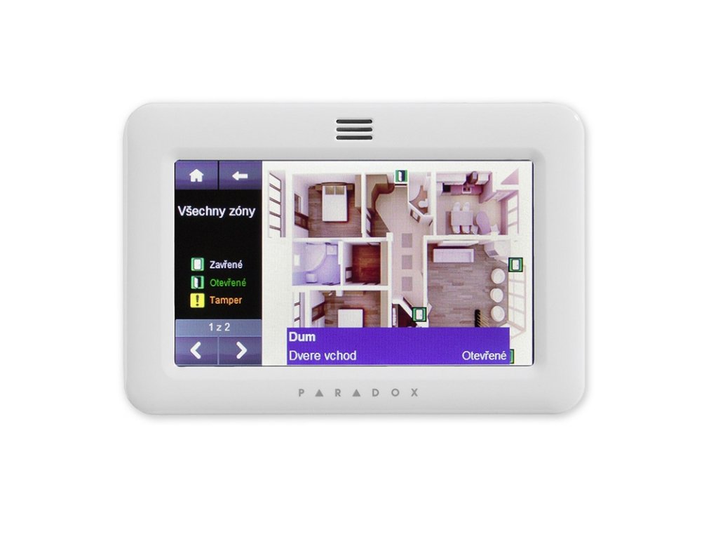 Dotyková ovládacia klávesnica biela, pre rady SP / MG / EVO, grafický dotykový farebný LCD displej 6,4 x 11,2 cm, signalizácia všetkých stavov pomocou ikon a popisov, prehľadné a pohodlné ovládanie priamo na dotykovom LCD, zobrazenie pôdorysov objektu so zobrazením stavu snímačov, zobrazenie Annunciátor-prehľadné zobrazenie stavu podsystémov a zón, 1 kláves. zóna / vstup pre vonkajší teplomer, zobrazenie vnútornej + vonkajšej teploty (externé čidlo), užívateľské prispôsobenie vzhľadu, obrázkov a radu zvukov, napájanie: 11-16V = / 100mA, rozmery 144x96x14 mm, microSD karta je súčasťou balenia.