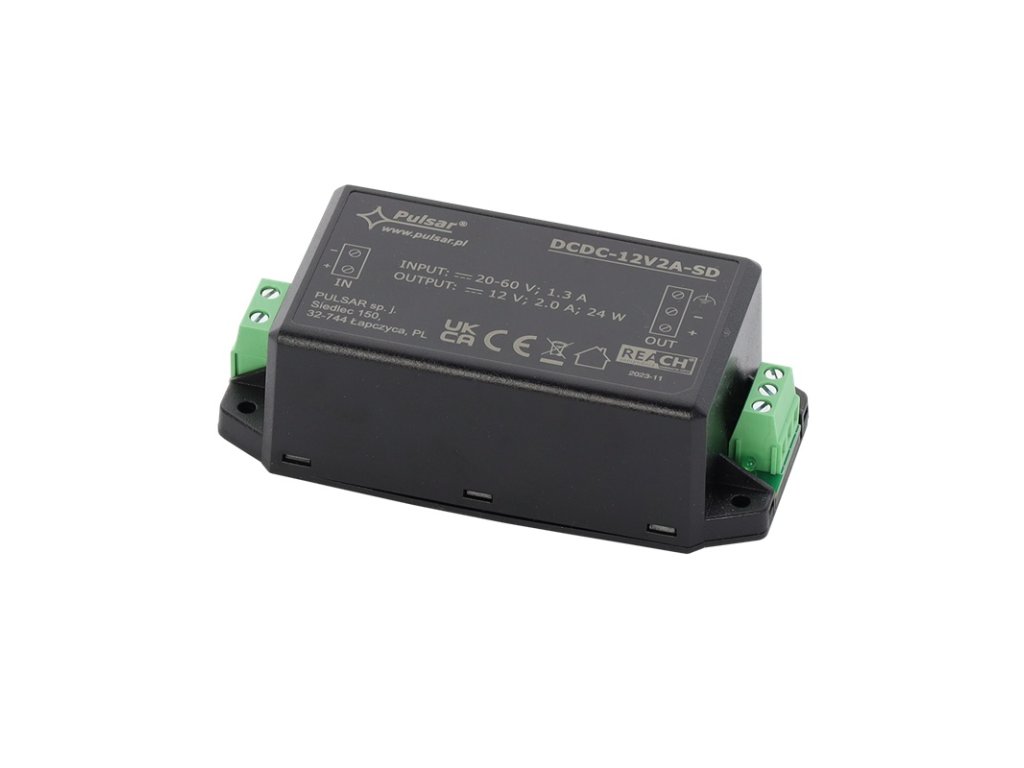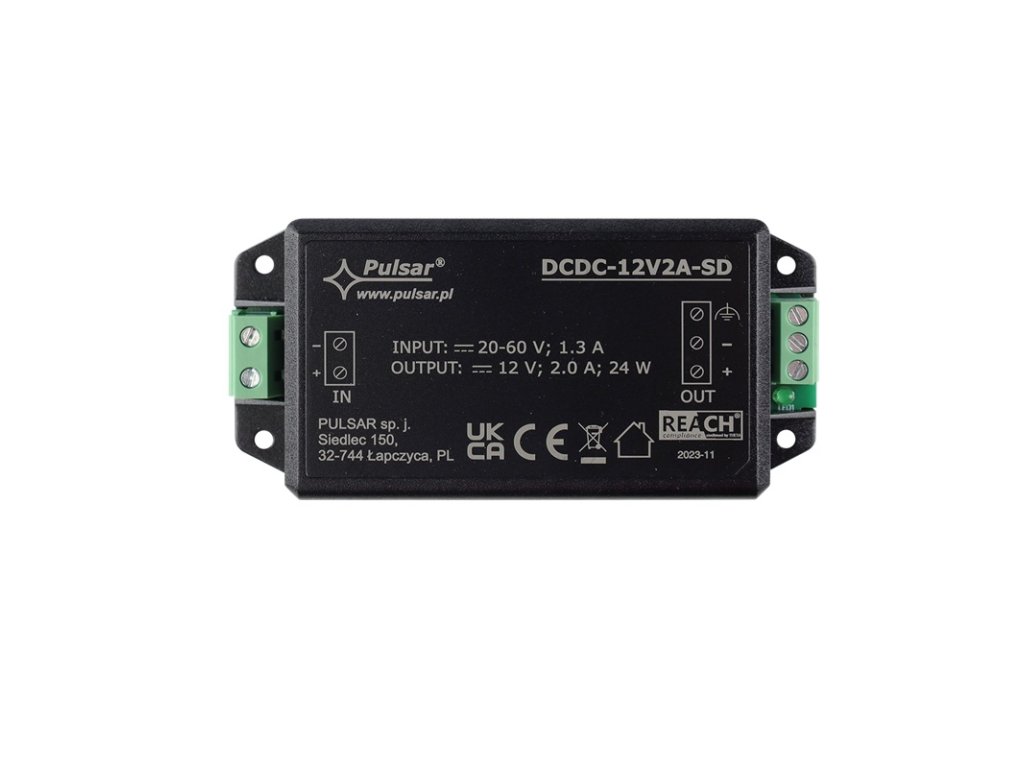 Menič napätia z 60 - 20 V na 12 V / 2 A pre napájanie GPRS-A a iných zariadení. Menič napätia pracuje v rozsahu vstupného napätia od 60 do 20 V a vyrobí 12 V pre napájanie ľubovoľného zariadenia s maximálnym zaťažením 2 A. Účinnosť 94%, rozmery 110 x 35 x 53 mm (±2 mm), montáž: montážne skrutky.