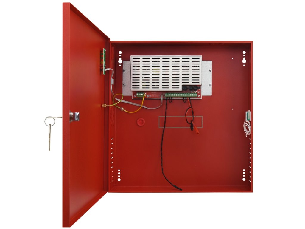 Napájací zdroj s výstupom 27,6 V DC / 5 A. Zdroj spĺňa normu EN 54 a stupeň krytia IP 30. Výstupy: porucha siete AC a všeobecná porucha. Výstup napájania: 4,2 A / 27,6 V DC na nepretržitú prevádzku, 5 A / 27,6 V DC na dočasnú prevádzku. Priestor pre zálohové akumulátory 2x TP 12-18 (akumulátor nie je súčasťou balenia). Vyhotovenie kov, farba červená (RAL3001), rozmery 385 x 402 x 88 mm.