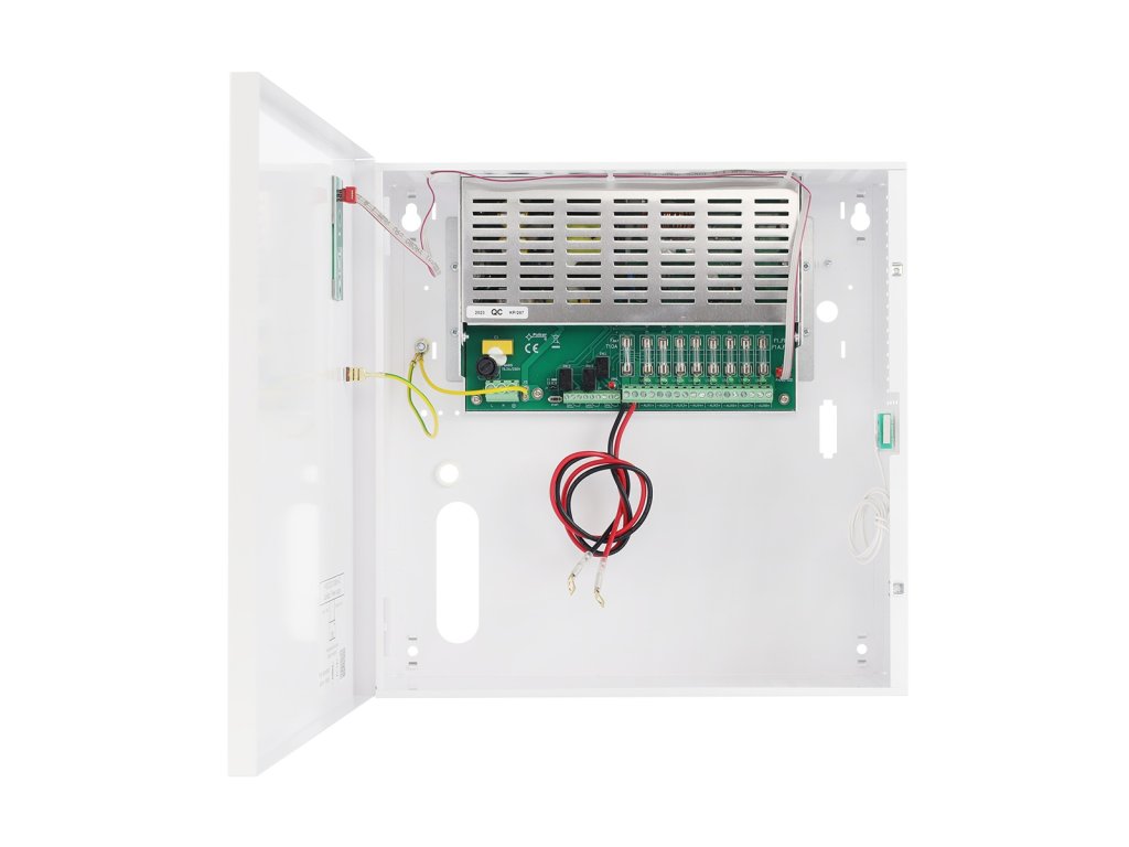 Vstupné napájanie 200-240 VAC, výstupný prúd 8x 1 A, celkový výstupný prúd s nabíjaním 10A, Výstupné napätie 11 - 13,8 V alebo 10 – 13,8 V pri prevádzke na batériu, kapacita batérie 17 – 20 Ah, miesto pre akumulátor 240 x 170 x 76 mm, ochrana proti skratu SCP, ochrana proti preťaženiu OLP, prepäťová ochrana OVP, ochrana akumulátora pred nadmerným vybitím UVP, sabotážny kontakt otvorenia skrinky, rozmery 300 x 300 x 105 mm, materiál: plech DC01 0,7 mm, farba: RAL9003 biela, IP 20.