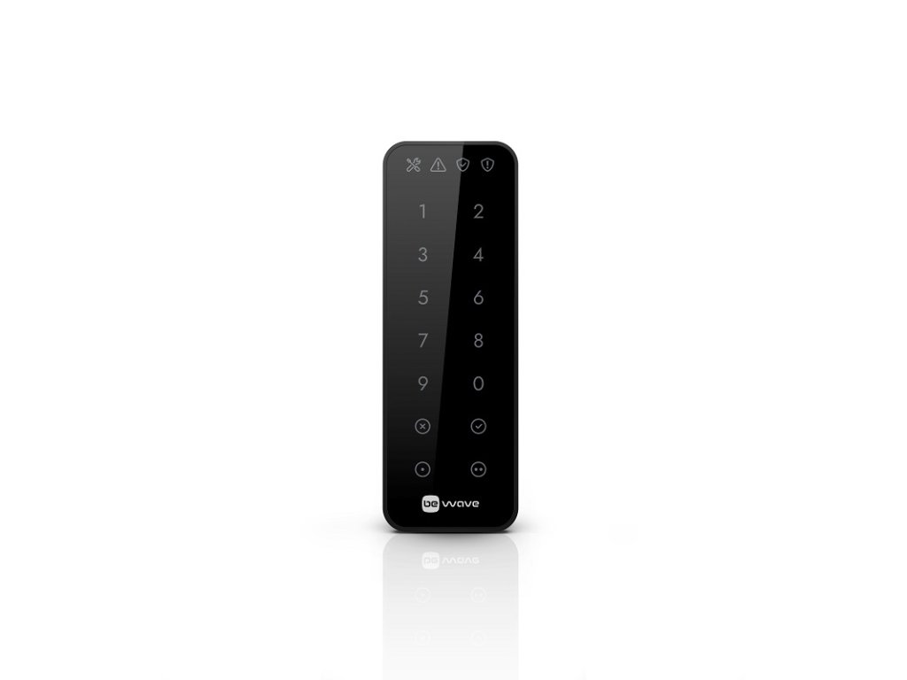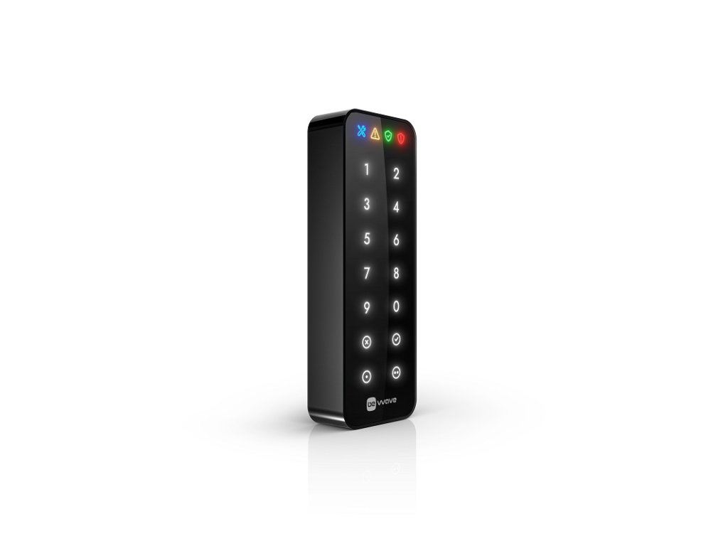 Bezdrôtová LED klávesnica pre systém BE WAVE (ABAX2 868 MHz), čierna, obojsmerná šifrovaná rádiová komunikácia vo frekvenčnom pásme 868 MHz, dosah do 1100 m na voľnom priestranstve, 2 funkčné klávesy, biele podsvietenie, 4 LED indikátory, stupeň zabezpečenia Grade 2 podľa EN 50131, batérie 2 x LR6 AA 1,5 V, možnosť pripojenia externého napájania 5 - 12 V DC (APS-055), rozmery 45 x 128 x 21 mm