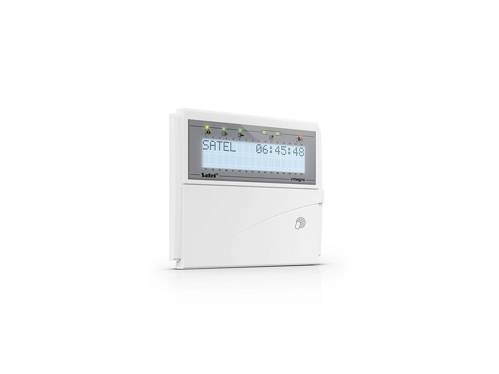 LCD klávesnica s RFID čítačkou pre systém INTEGRA, biele podsvietenie, frekvencia čítačky 125 kHz, formát kariet UNIQUE, EM4001, EM4002, EM4003, EM4102, LED diódy indikujú stav systému, rýchle zapnutie režimu stráženia, klávesy pre napadnutie-požiar-pomoc, 2x programovateľný vstup, konektor RS-232 na pripojenie programu GUARDX, stupeň zabezpečenia Grade 3 podľa EN 50131, max. odber prúdu 156 mA, rozmery 140 x 126 x 26 mm