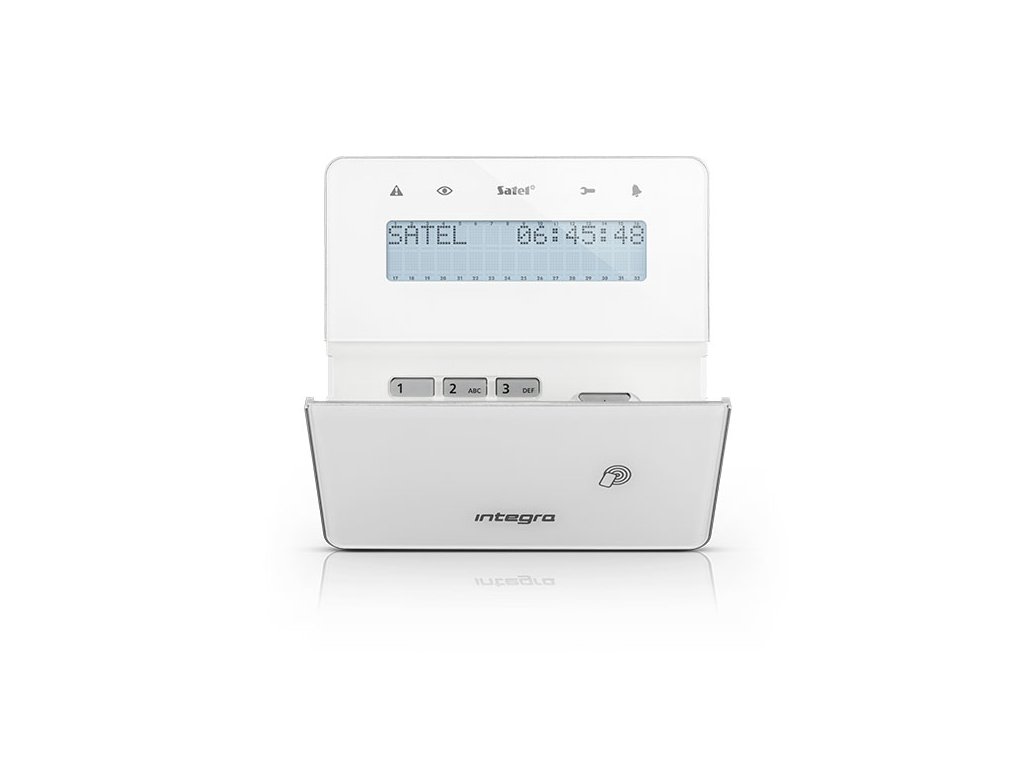 Bezdrôtová LCD klávesnica s RFID čítačkou pre systém INTEGRA (ABAX 868 MHz), (biela-strieborná-biela), obojsmerná šifrovaná rádiová komunikácia vo frekvenčnom pásme 868 MHz, dosah do 800 m na voľnom priestranstve s ACU-120 / 400 m s ACU-270, biele podsvietenie, frekvencia čítačky 125 kHz, formát kariet UNIQUE, EM4001, EM4002, EM4003, EM4102, LED diódy indikujú stav systému, rýchle zapnutie režimu stráženia, klávesy pre napadnutie-požiar-pomoc, lítiové batérie 2x CR123A 3 V, rozmery 145 x 143 x 25 mm