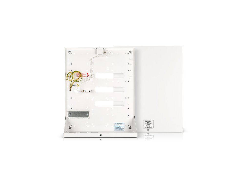Kovová skrinka na povrchovú montáž s dvojitou sabotážnou ochranou pred otvorením a odtrhnutím od steny, bez transformátora, miesto pre trafo TR 40 VA, TR 60 VA alebo zdroj APS-412, APS-612, miesto pre akumulátor 18 Ah, stupeň zabezpečenia Grade 3 podľa EN50131, pre moduly 12x INT-E alebo 6x INT-O / INT-PP, viac modulov vo všeobecnej príručke, rozmery 328 x 406 x 120 mm