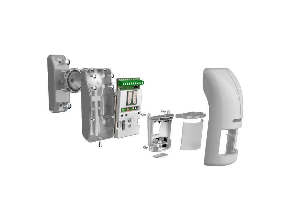 Vonkajší PIR + MW detektor, dvojitý PIR element, digitálny algoritmus detekcie pohybu, konfigurácia citlivosti pomocou ovládača OPT-1, detektor súmraku, antimasking, PET imunita do 20 kg, digitálna kompenzácia teploty, kontrola napätia napájania, trojfarebná signalizačná LED, dvojitá sabotážna ochrana pred otvorením a odtrhnutím od steny, kontrola priestoru pod detektorom, odolnosť na falošné poplachy spúšťané pohybujúcimi sa objektmi, ktoré ale nemenia svoje umiestnenie (napr. konáre stromov), stupeň zabezpečenia Grade 2 podľa EN 50131, IP 54, pracovná teplota od -40 °C do +55 °C, max. odber prúdu 20 mA, rozmery 65 x 138 x 58 mm, dosah detekcie 15 x 12 m 100°, pre inštaláciu do rohu miestnosti je potrebný držiak BRACKET C