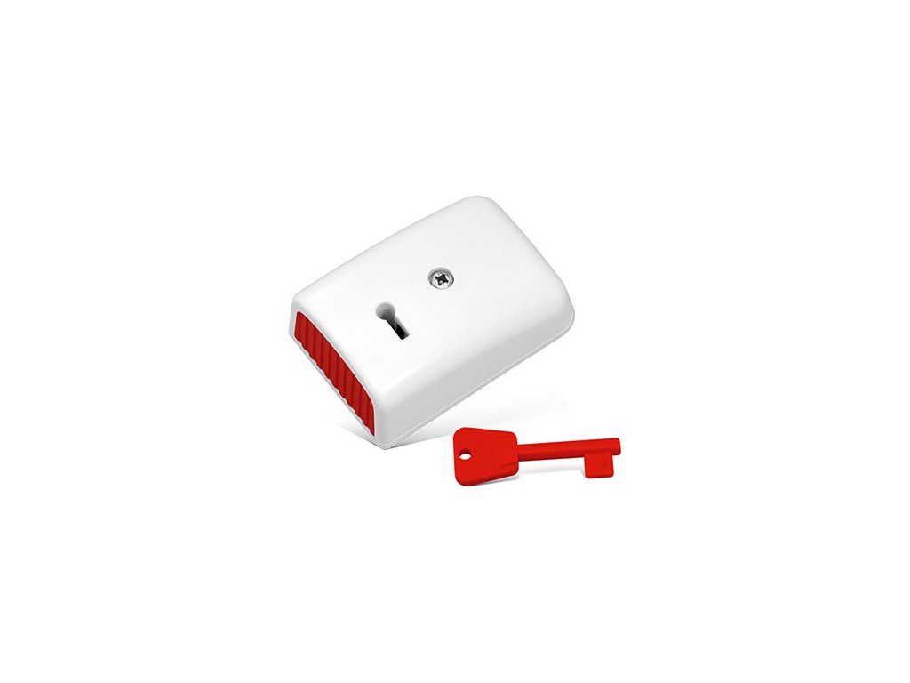 Panik tlačidlo s mechanickou pamäťou, kľúč na návrat do východiskovej polohy, NC kontakt, rozmery 40 x 60 x 25 mm