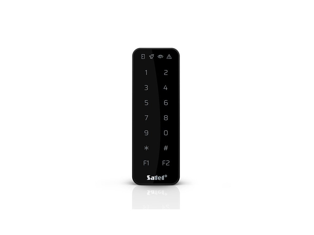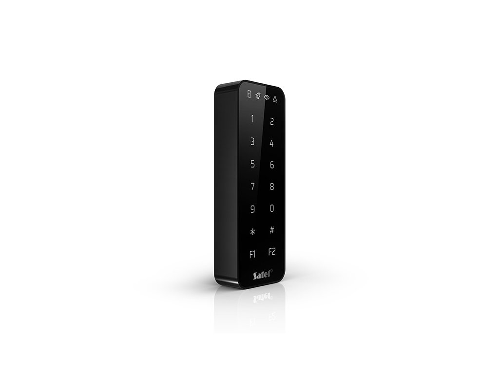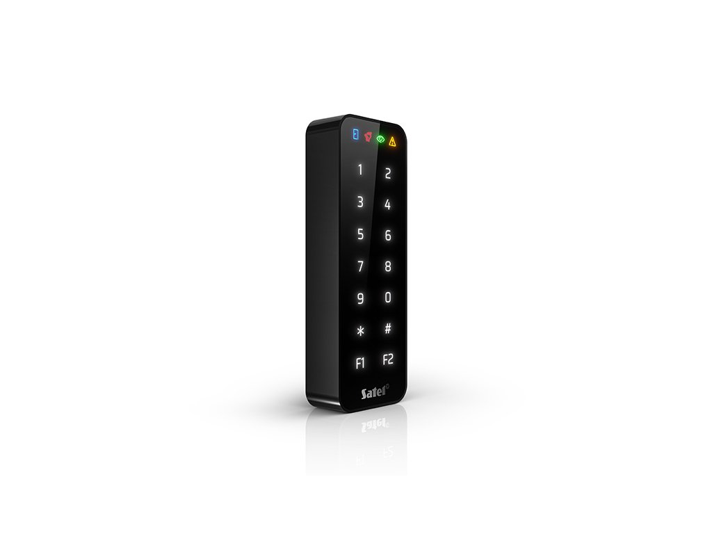 Vnútorná klávesnica pre skupiny s MIFARE® čítačkou (čierna) pre systémy INTEGRA / ACCO / výrobcu tretích strán / autonómna čítačka (128 kariet/kódov), biele podsietenie, 4x LED, relé výstup na otvorenie zámku 1 A / 30 V DC, výstup BELL OC 30 mA / 12 V DC, vstup na kontrolu stavu dverí, vstup pre odchodové tlačidlo, montáž na stenu alebo na rám dverí, frekvencia čítačky 13,553–13,567 MHz, formát kariet Ultralight CSN/SSN, Classic CSN/SSN/MSN, DESFire (EV1 / EV2 / EV3) CSN/MSN, podpora protokolov Wiegand / OSDP ver. 2.2; RS-485, akustická signalizácia, dvojitá sabotážna ochrana pred otvorením a odtrhnutím od steny, pracovná teplota od -25 °C do +55 °C, max. odber prúdu 120 mA, rozmery 45 x 128 x 21 mm