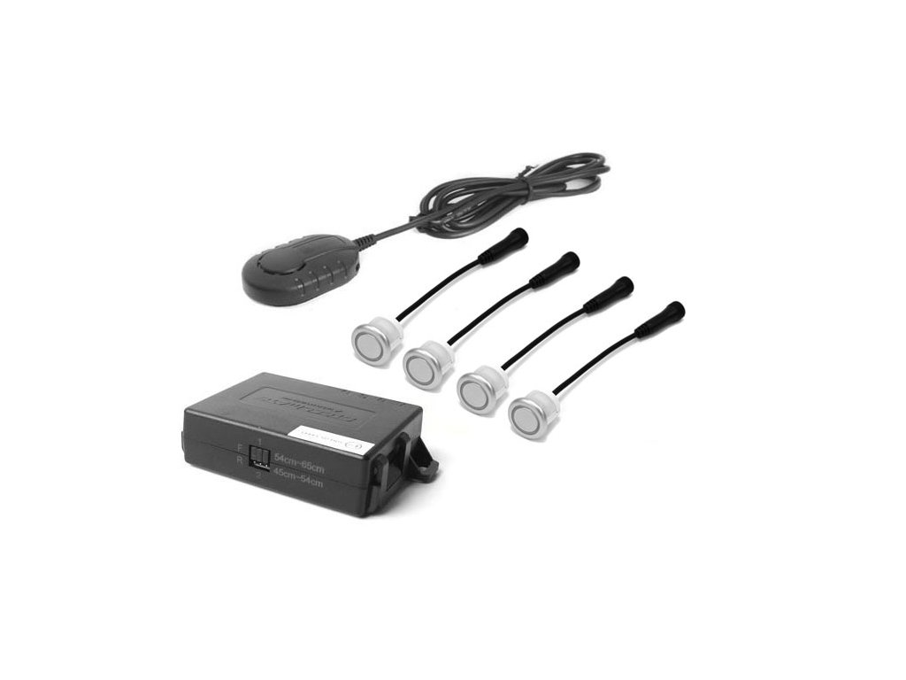 Parkovací asistent STEELMATE so 4 snímačmi striebornej farby a akustickou signalizáciou, určený pre inštaláciu do zadného alebo predného nárazníka vozidla. Systém je doplnený o funkciu Antihook a automatickú identifikáciu vadného senzoru, nastavenie citlivosti, učiacu funkciu, bzučiak s nastaviteľnou hlasitosťou a výškou tónu. Napájacie napätie 12V/24V. Dĺžka vodičov k senzorom je 2,3m.