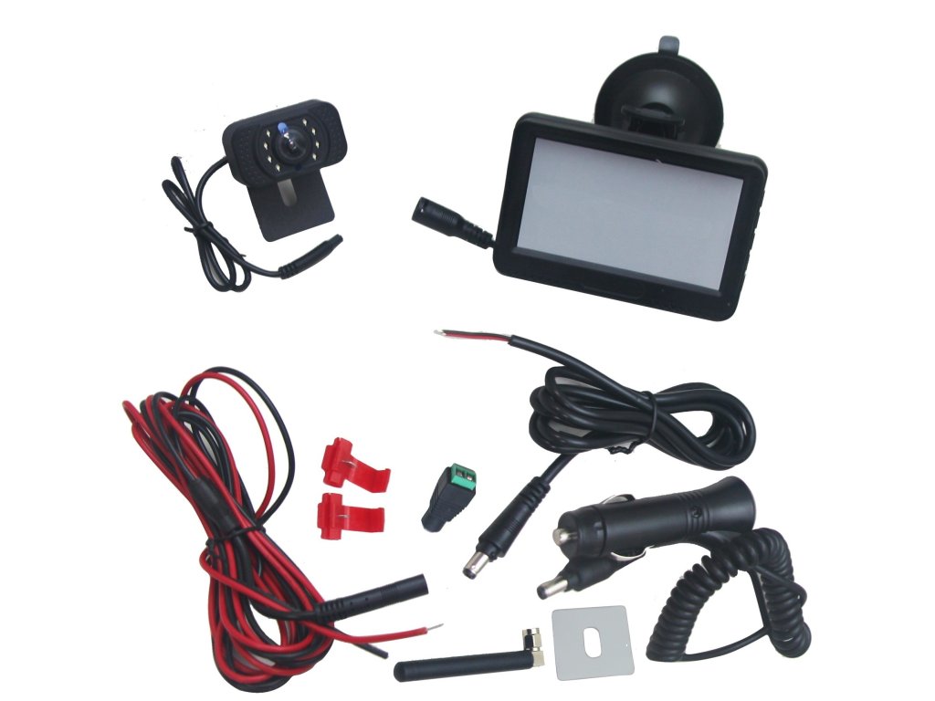 Obsah balenia: 1x monitor s prísavkou, 1x kamera, 1x anténa, 1x cigaretový napájací kábel, 1x 2-vodičový napájací kábel pre monitor, 1x napájací kábel pre kameru, 1x obojstranná 3M páska