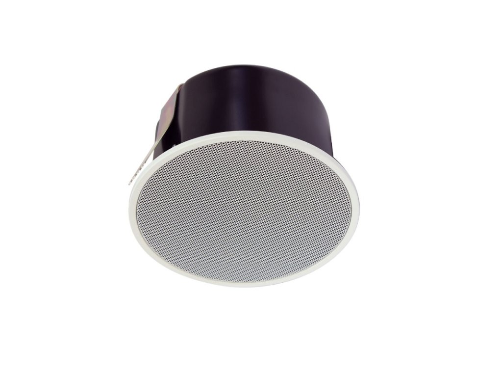Stropný širokopásmový reproduktor 6 W / 100 V s protipožiarnym krytom, odbočky 6 W, 3 W, 1,5 W a 0,8 W, citlivosť 95 dB (1 W / 1 m, 500 Hz–5 kHz), frekvenčný rozsah 170 Hz–20 kHz, vyžarovací uhol 175° (1 kHz), reproduktor 120 mm, keramická svorkovnica s tepelnou poistkou a blokovacím kondenzátorom, kovová skrinka a mriežka, vonkajší priemer 180 mm, montážny otvor 156 mm, vnútorné použitie typ A, biely, pružinová montáž do podhľadu, EN 54-24